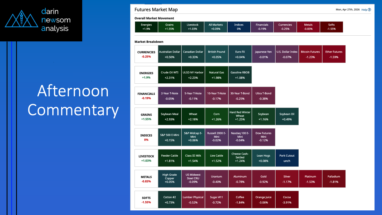 A Mixed Market Monday Darin Newsom2026-04-27T14:33:43-05:00April 27th, 2026|Afternoon Commentary, Commentary| Username Password Remember Me Forgot Password Related Posts AM Commentary: Nothing New April 27th, 2026 Nothing New April 27th, 2026 March 2026: Cold Storage April 24th, 2026 CFTC Commitments of Traders April 24th, 2026