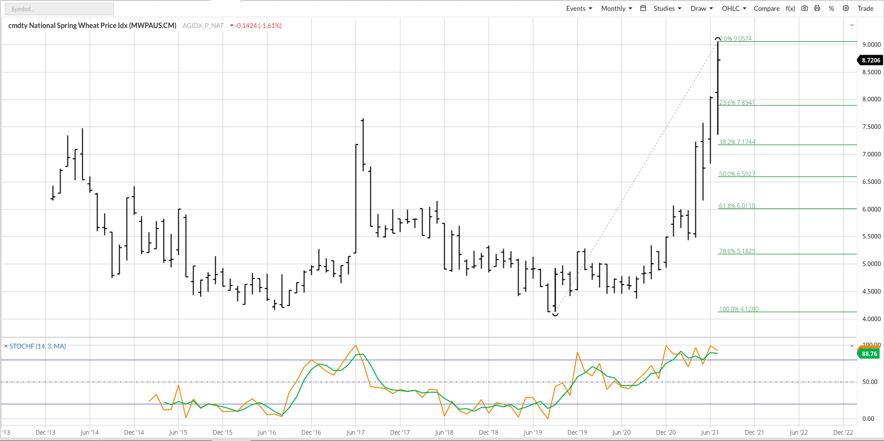 A look at the monthly chart for the cmdty National HRS Wheat Price Index (HSPI, weighted national average cash price) shows us a familiar patter, something we’ve seen so far in soybeans, canola, bean oil, lumber, and what seems like countless other commodities. The HSPI is in a major (long-term) uptrend that is accelerating, driven higher by increasingly bullish long-term fundamentals. Regarding the latter, Minneapolis (HRS) futures spreads are inverted from September through July while national average basis has rocketed to 32 cents under September futures on July 29 from the July 1 calculation of the cmdty National HRS Wheat Basis Index of 48 cents under. While market moves like this can come to an abrupt end (e.g. coffee), the HSPI could continue to push higher due to hot and dry weather across the Northern Plains. Given this, the protein market could get equally explosive during August, putting the spotlight on the HSPI-HWPI (HRW wheat) spread.