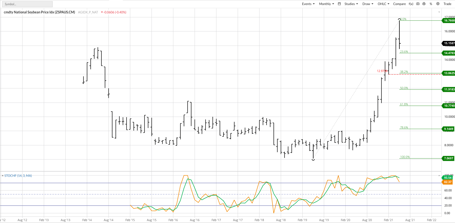 The major (long-term) uptrend of the cmdty National Soybean Price Index (NSPI, weighted national average cash price) looks to have come to an end during May as the NSPI posted a bearish spike reversal. After posting a high of $16.7688 the NSPI fell to a low of $14.7712 before finishing the month at $15.1587, below the April settlement of $15.46. The reversal pattern established during may coincided with another bearish crossover by monthly stochastics above the overbought level of 80%, also a signal the major trend is set to turn down. The downside target area is between $13.0625 and $10.7740, prices market the 38.2% and 61.8% retracement levels of the previous major uptrend from $7.0697 (May 2019) through the May 2021 high. However, given the continued bullishness of the soybean futures market’s forward curve, inverted through at least the November 2024 contract, the 50% retracement level near $11.92 could hold the downtrend. Initial support is at the 4-month low of $12.9758.
