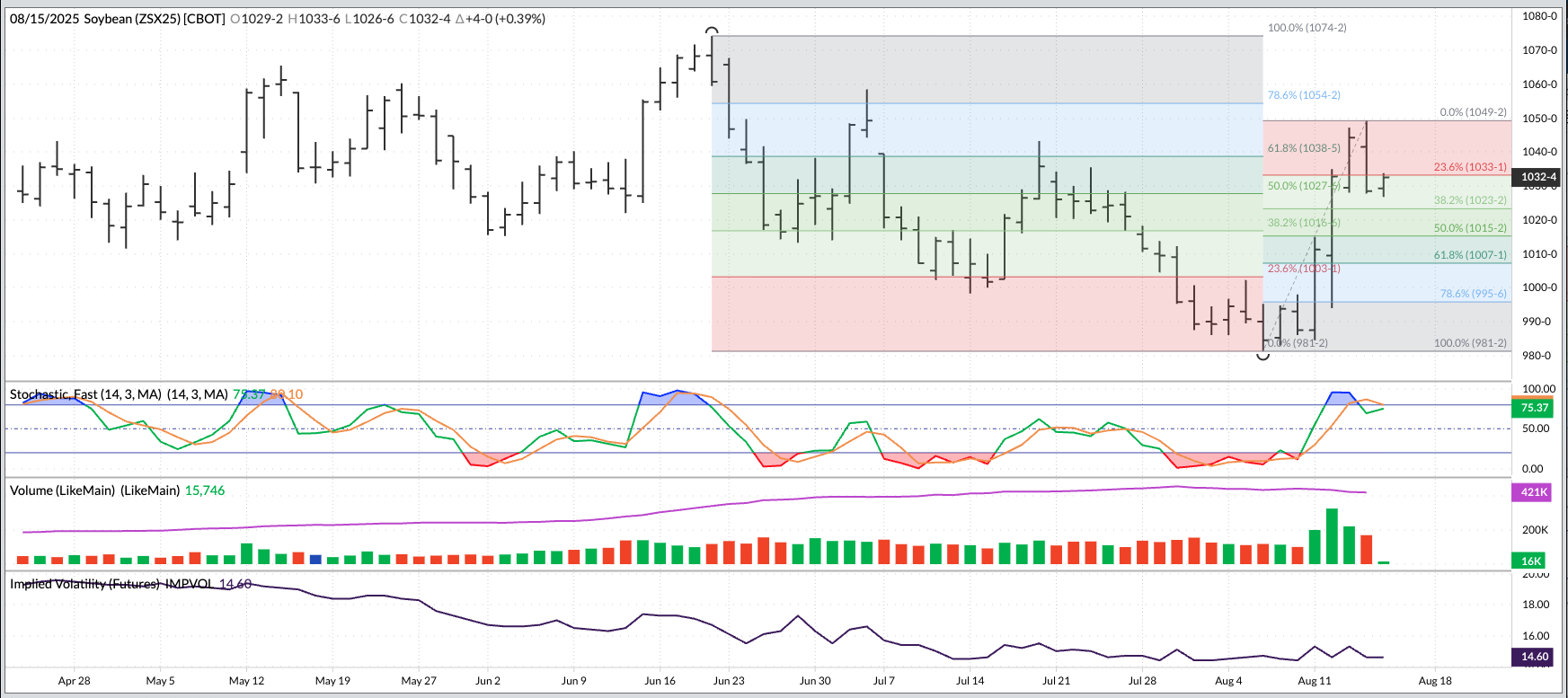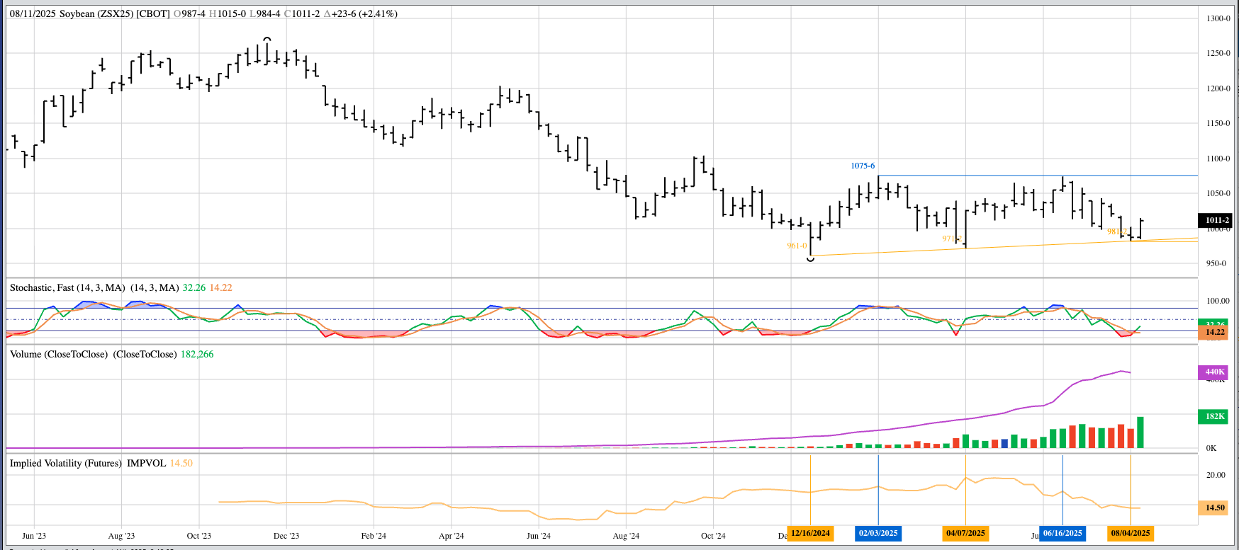 As mentioned in Friday's Morning Commentary, the November soybean futures contract completed a bearish technical reversal on its short-term daily chart Thursday: Nov25 posted a high of $10.4925, taking out [...]