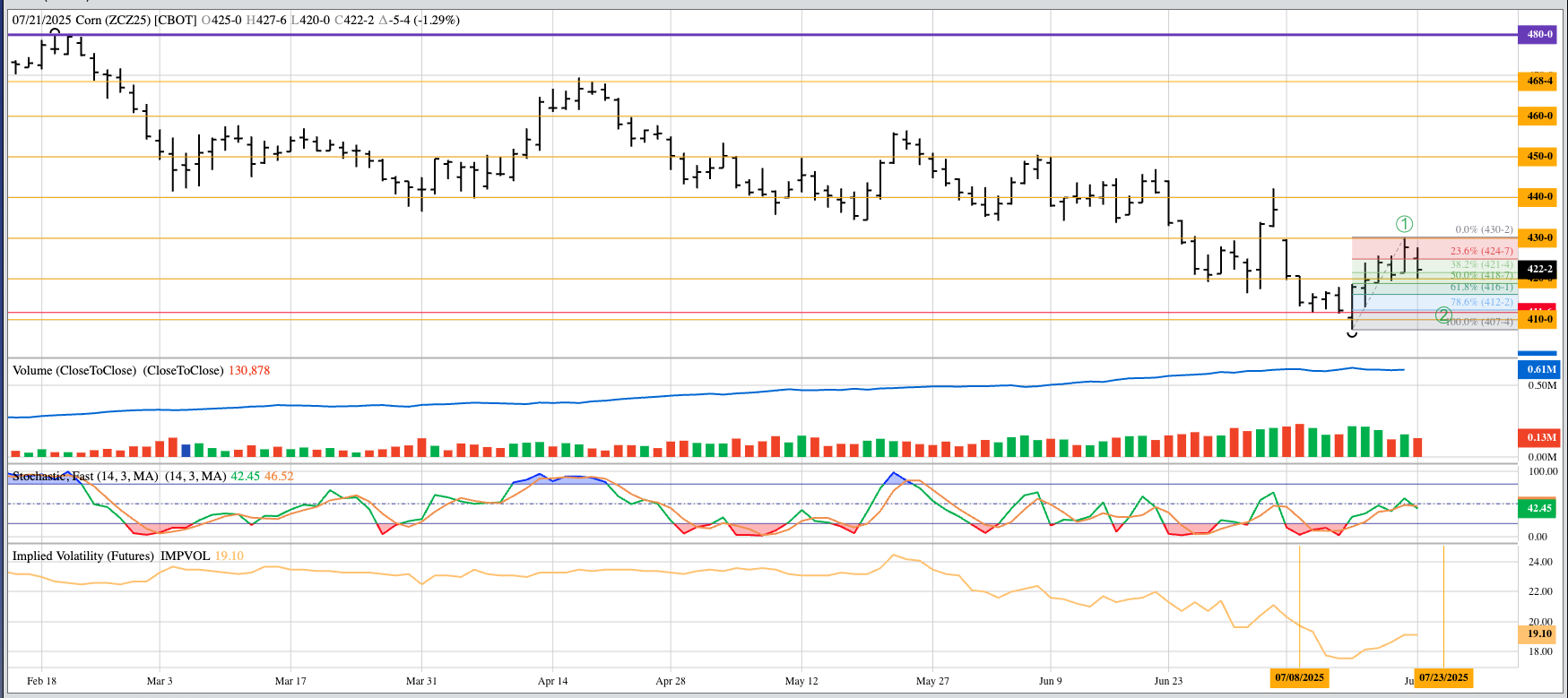 December corn closed lower Monday, finishing at $4.2225, down 5.5 cents for the day. It's interesting to note Monday's low was the round number $4.20, and that trade volume was [...]