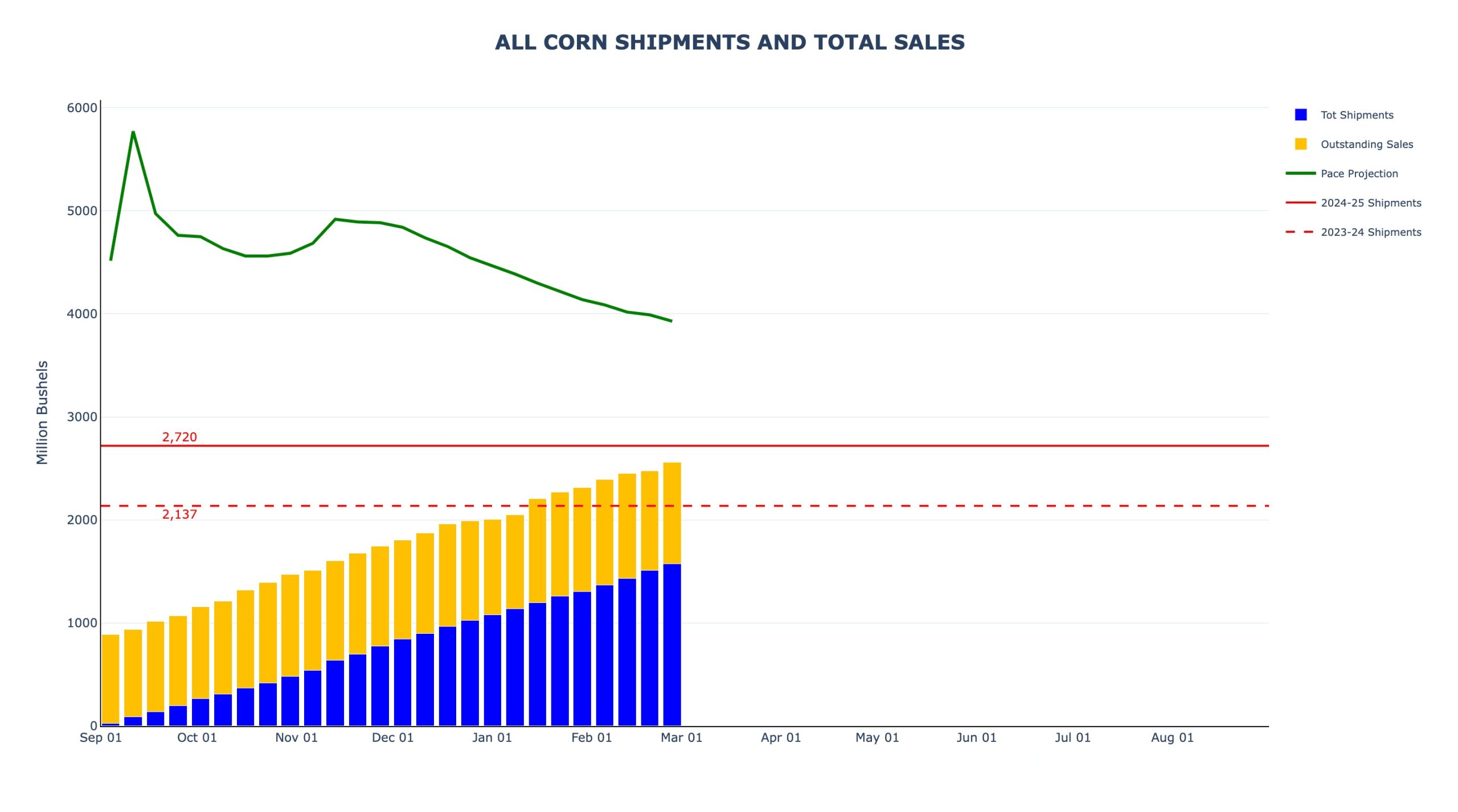The latest weekly export sales and shipment update showed 2025-2026 marketing year export shipments of U.S. Corn at 1,576 mb (blue column) through Thursday, February 26, a point in the [...]