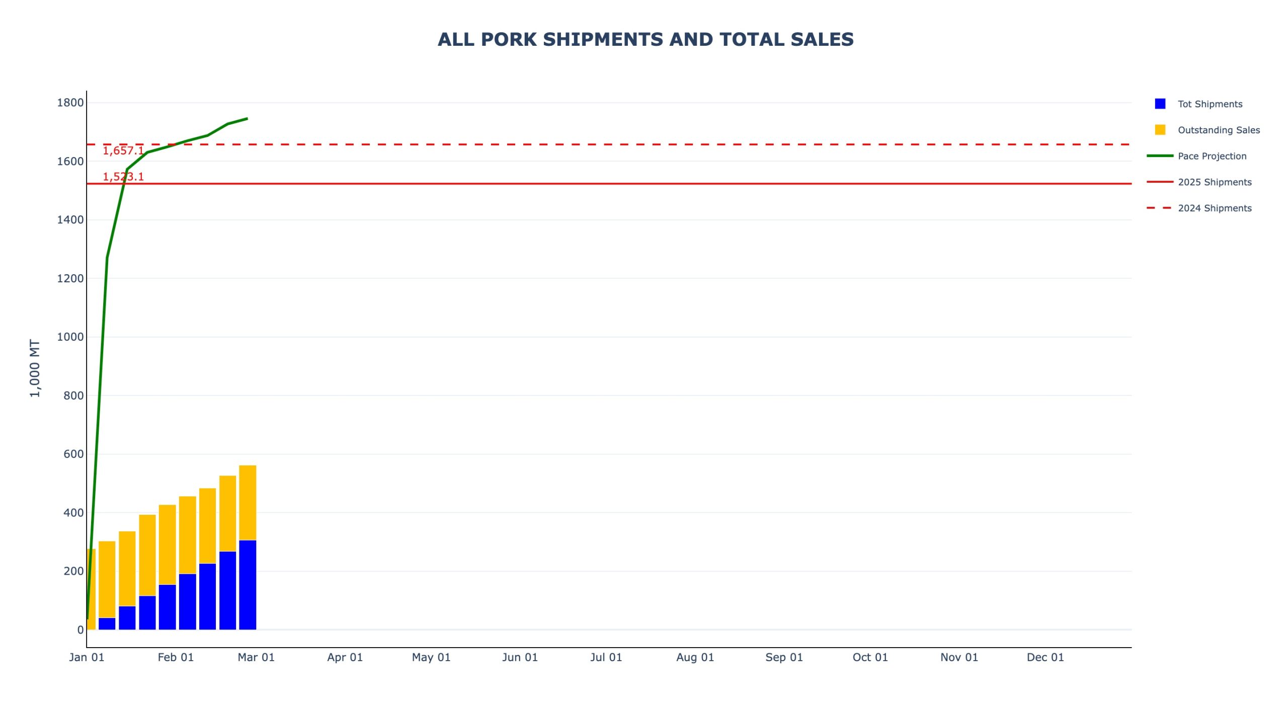 The latest weekly export sales and shipment update showed 2026 calendar-year export shipments of U.S. pork at 305.4 1,000 MT (blue column) through Thursday, February 26, a point in the [...]
