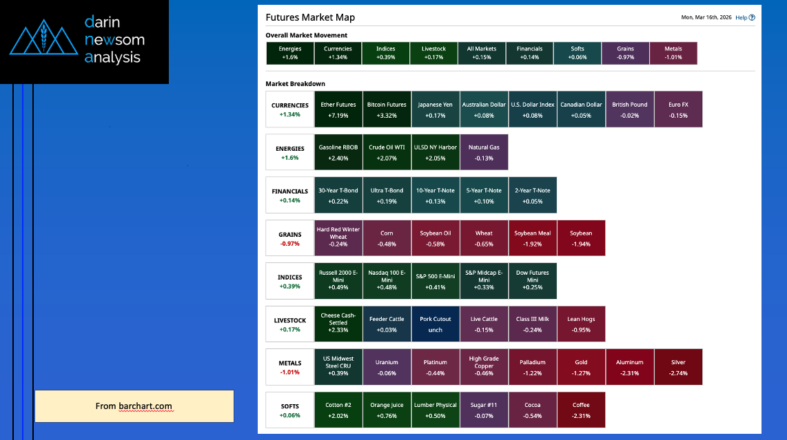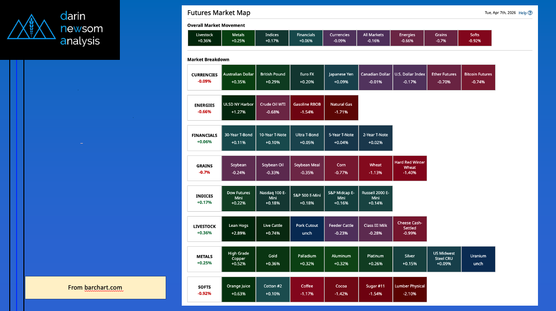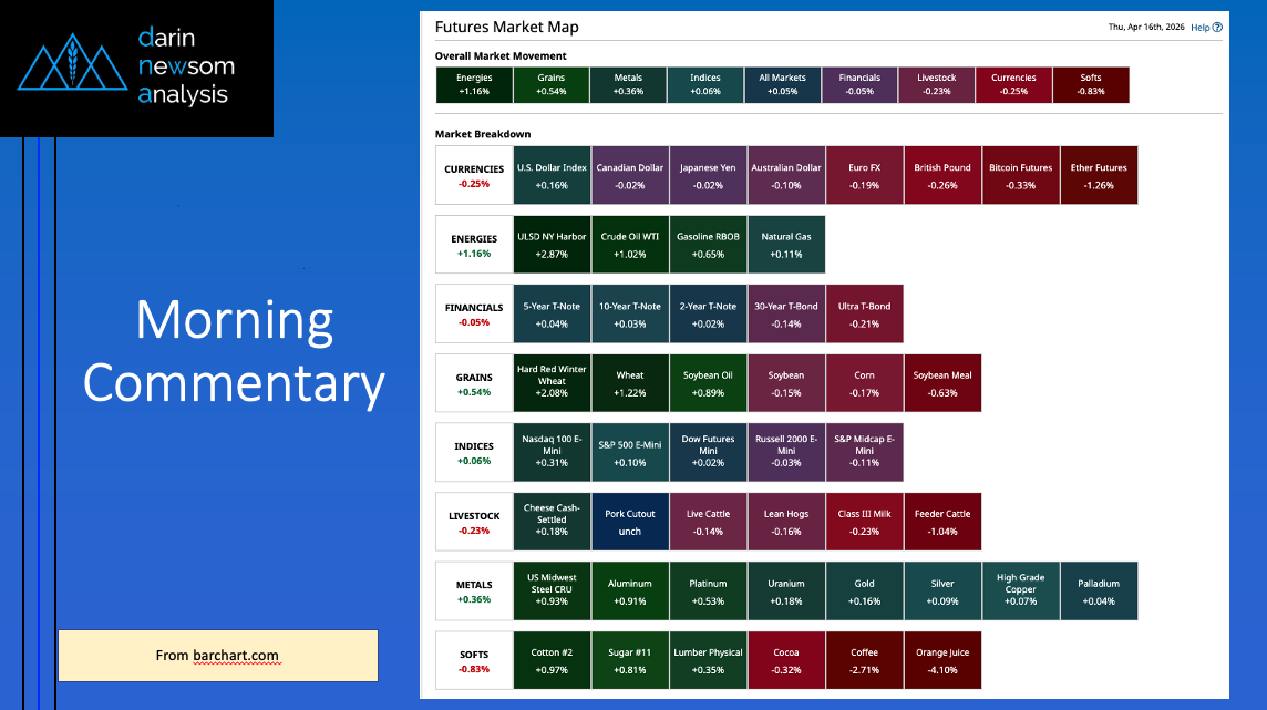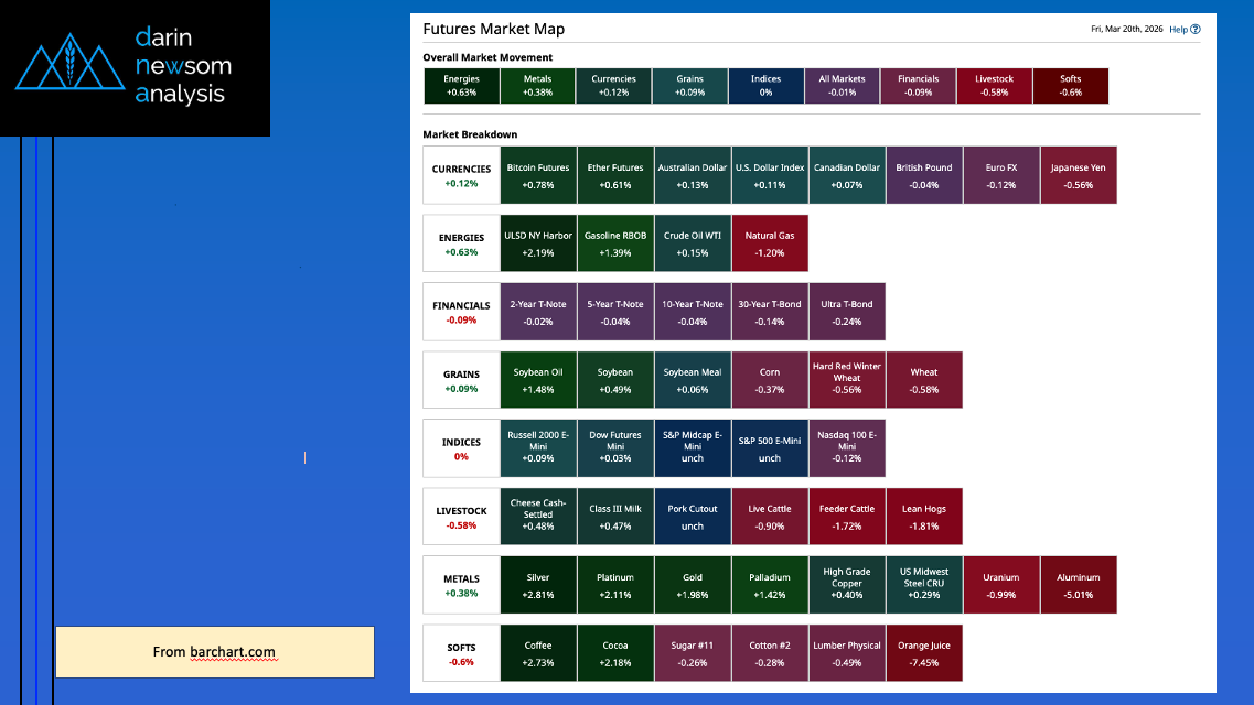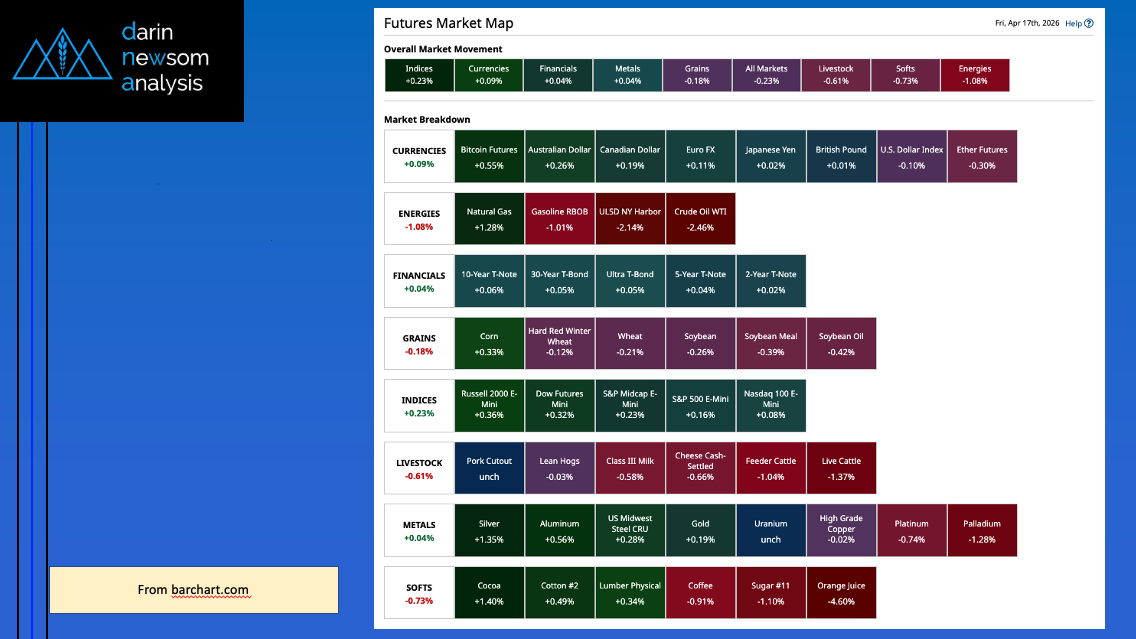 Morning Summary: The commodity complex was interesting overnight. A look at Friday morning’s Barchart Futures Market Heat map (slide 2) shows the complex was nearly evenly split between sectors in [...]