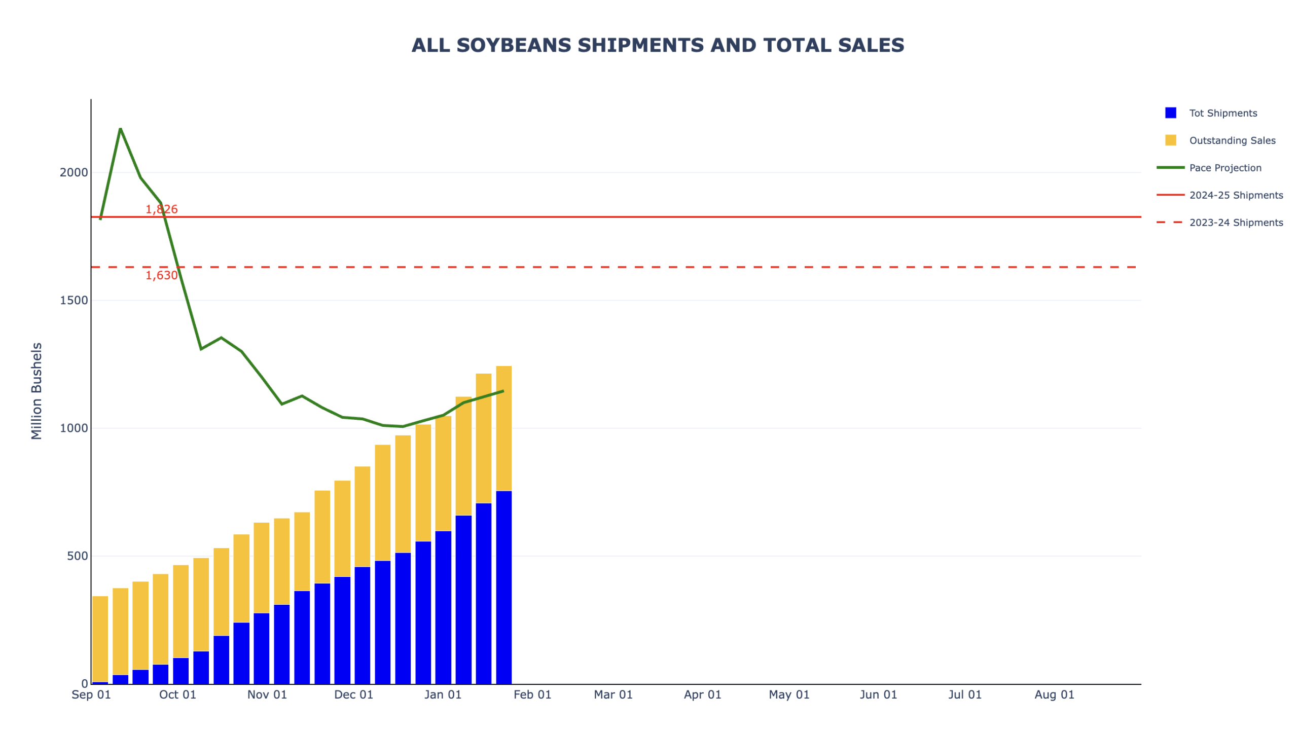 The latest weekly export sales and shipment update showed 2025-2026 marketing year export shipments of U.S. soybeans at 755 mb (blue column) through Thursday, January 22, a point in the [...]