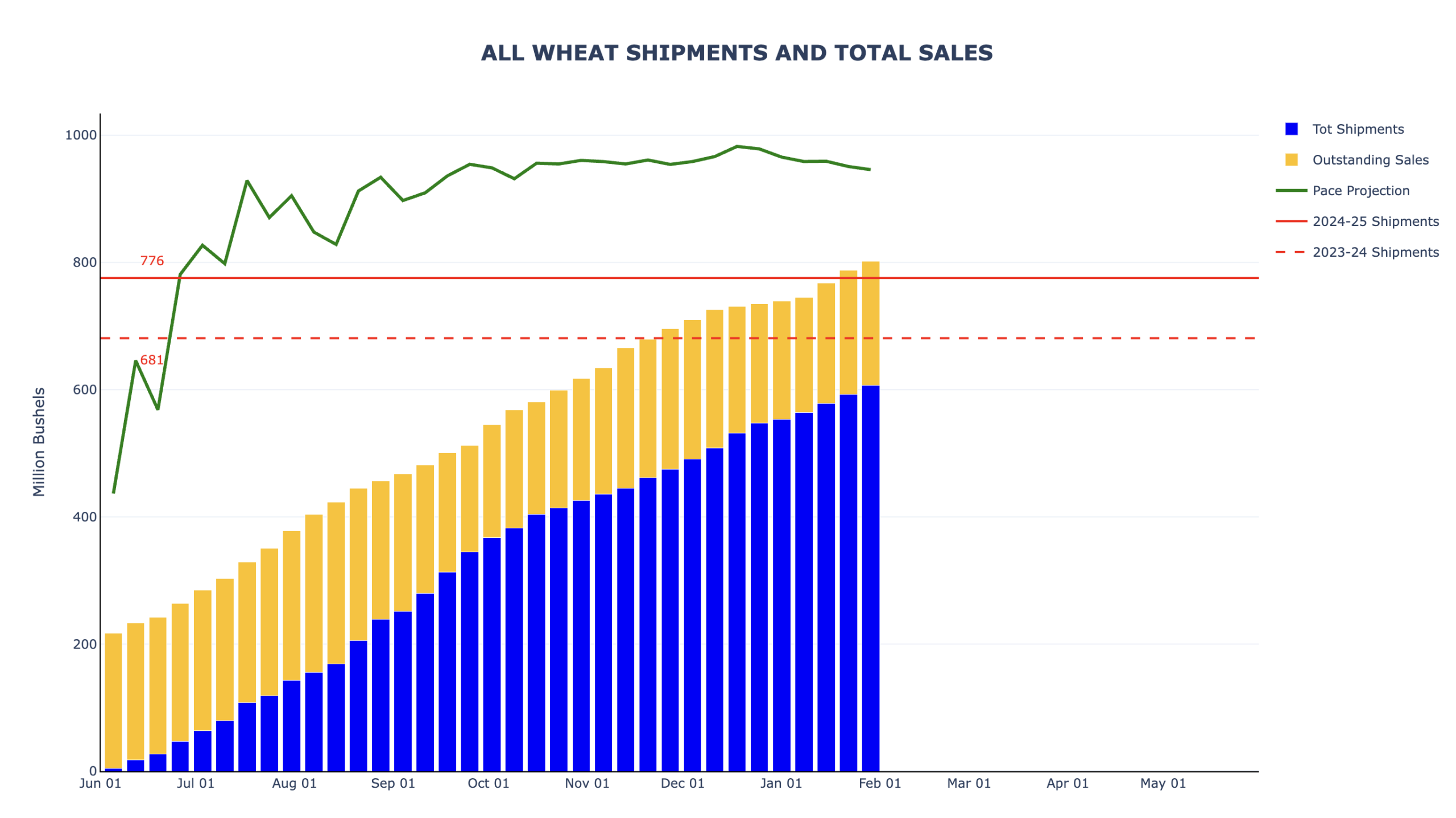 The latest weekly export sales and shipment update showed 2025-2026 marketing year export shipments of all U.S. Wheat at 607 mb (blue column) through Thursday, January 29, a point in [...]