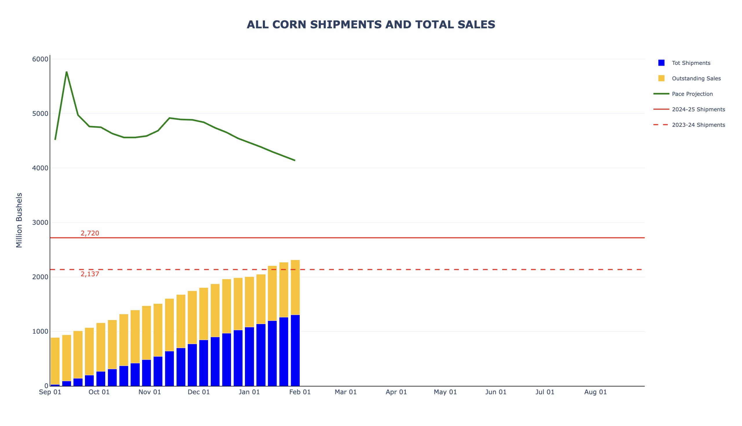 The latest weekly export sales and shipment update showed 2025-2026 marketing year export shipments of U.S. Corn at 1,308 mb (blue column) through Thursday, January 29, a point in the [...]