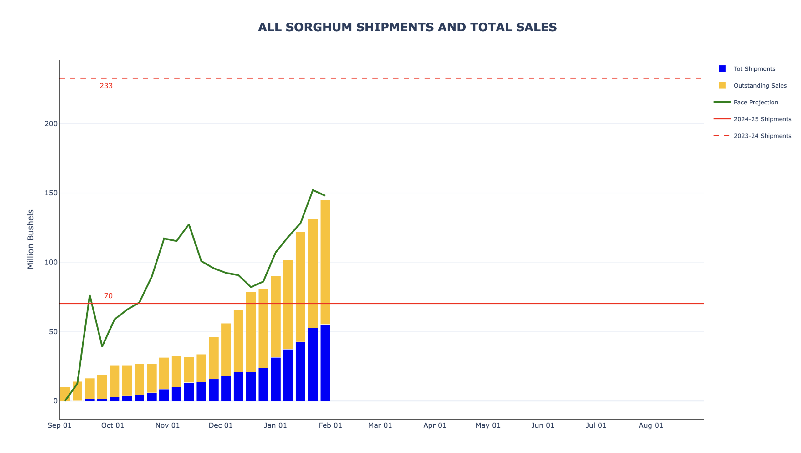 The latest weekly export sales and shipment update showed 2025-2026 marketing year export shipments of U.S. sorghum at 55 mb (blue column) through Thursday, January 29, a point in the [...]