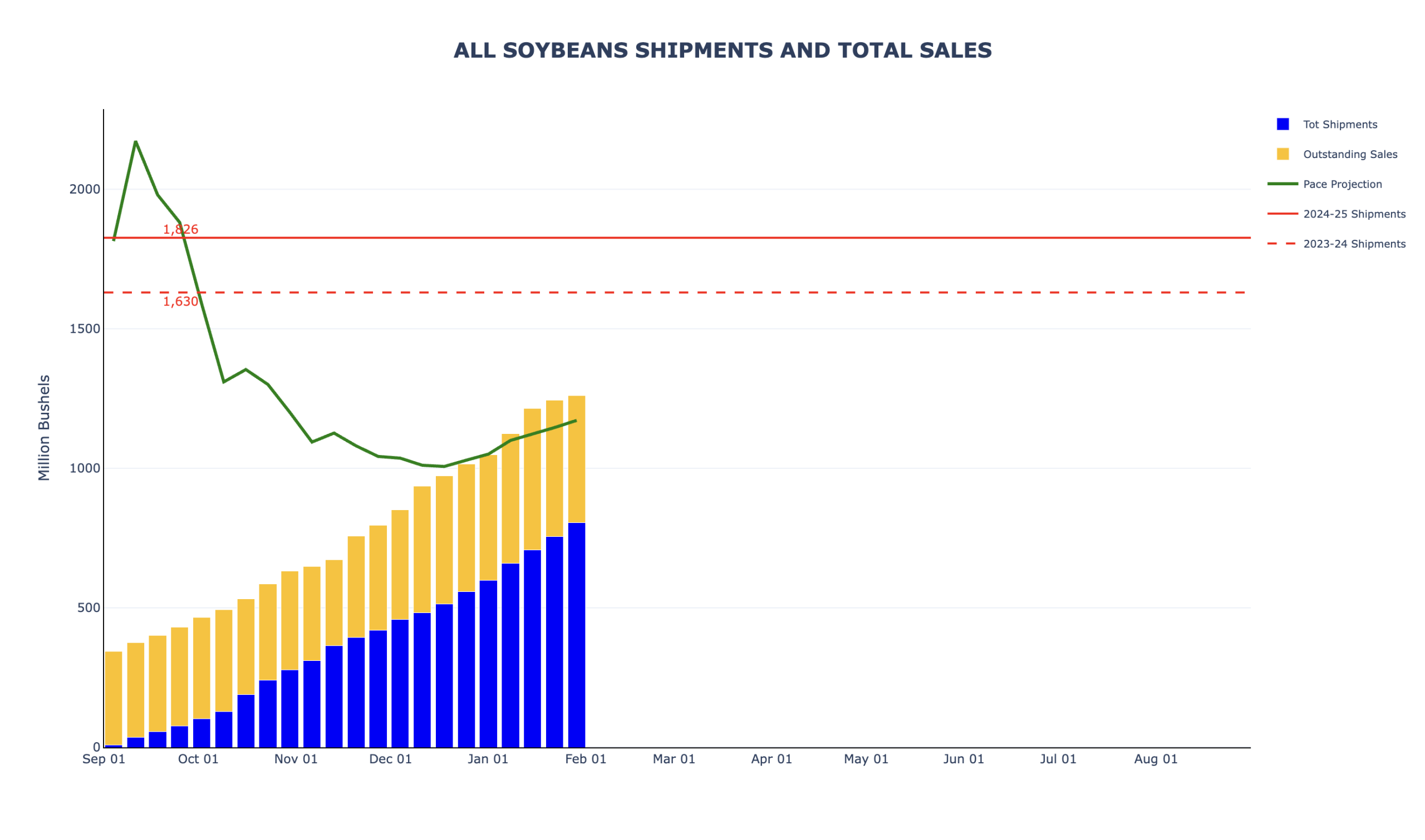 The latest weekly export sales and shipment update showed 2025-2026 marketing year export shipments of U.S. soybeans at 806 mb (blue column) through Thursday, January 29, a point in the [...]