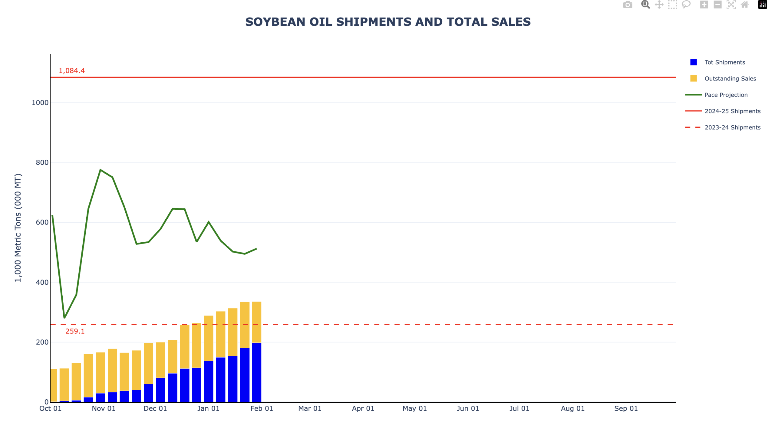 The latest weekly export sales and shipment update showed 2025-2026 marketing year export shipments of U.S. soybean oil at 198.6 (1,000 mt) (blue column) through Thursday, January 29, a point [...]