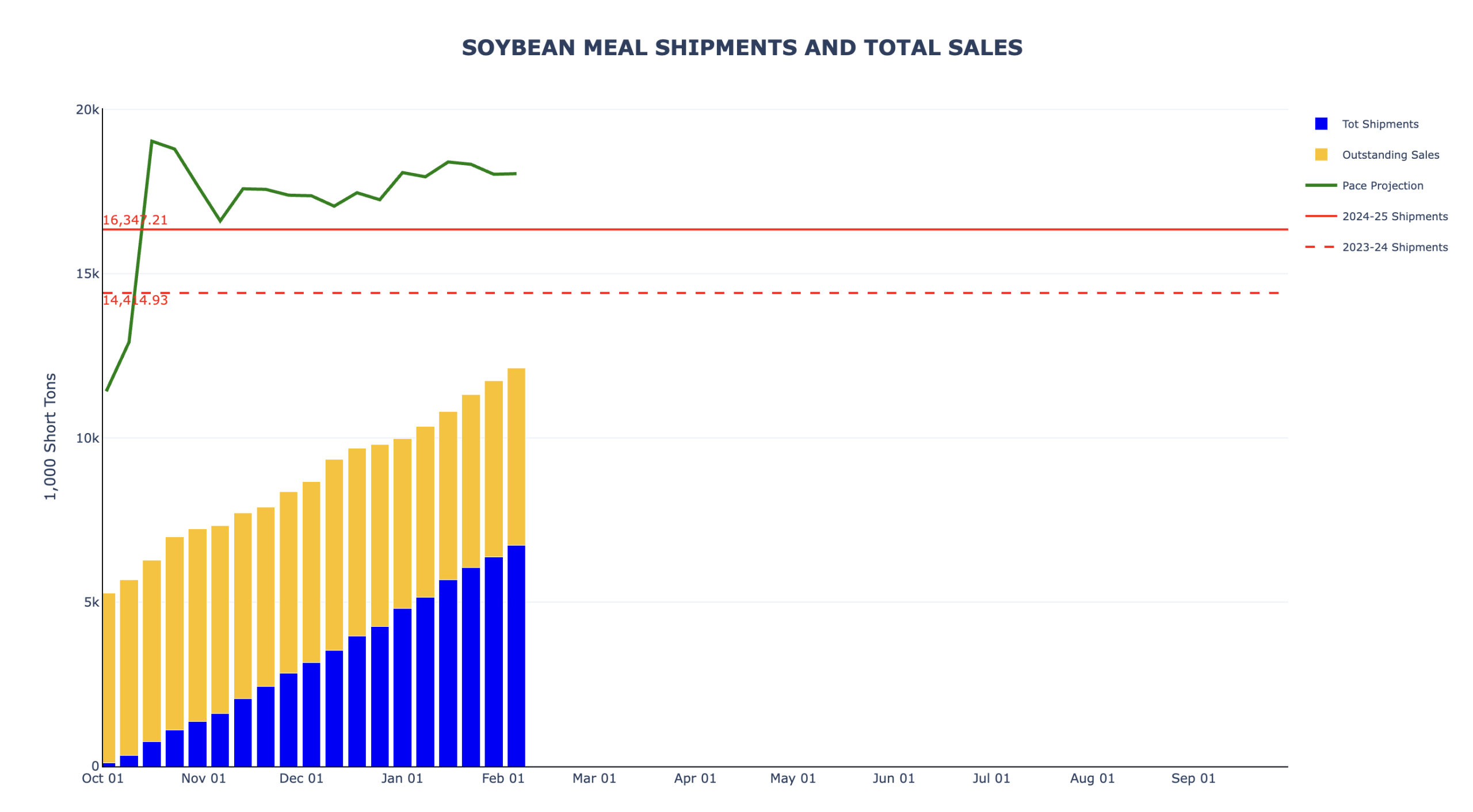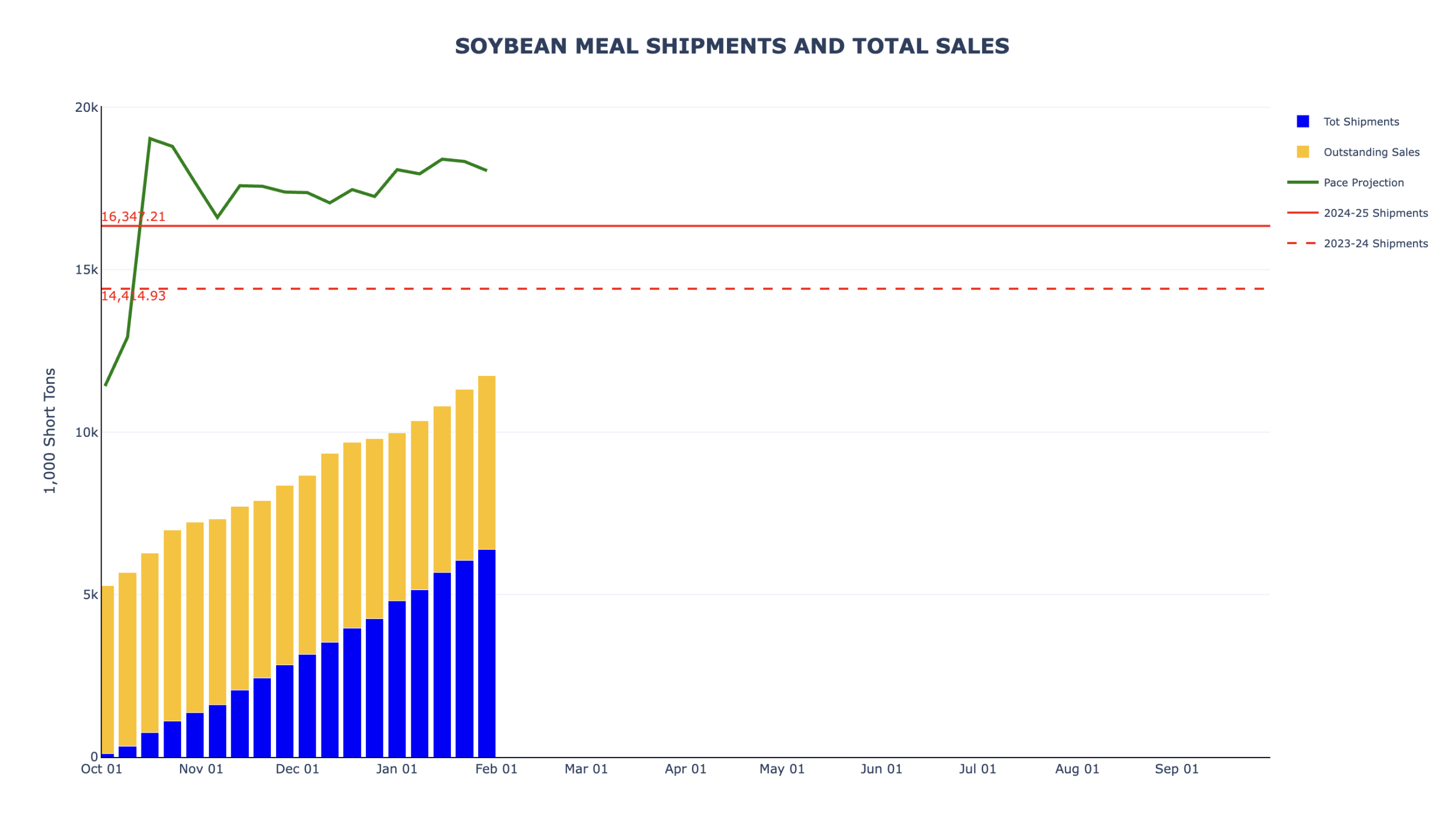 The latest weekly export sales and shipment update showed 2025-2026 marketing year export shipments of U.S. soybean meal at 6,384.96 (1,000 st) (blue column) through Thursday, January 29, a point [...]