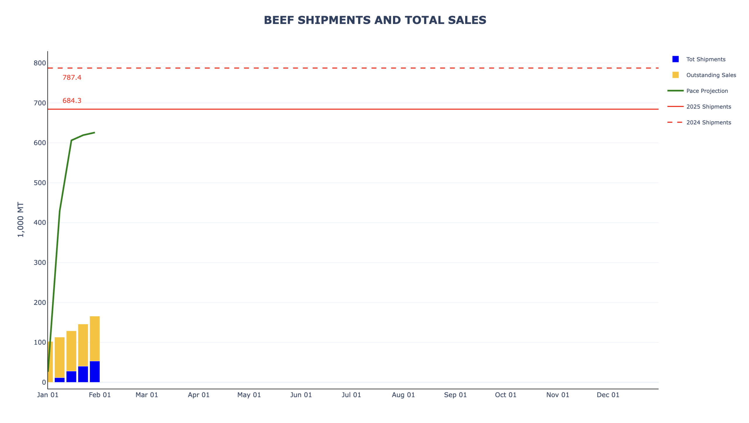 The latest weekly export sales and shipment update showed 2026 calendar-year export shipments of U.S. beef at 53.3 1,000 MT (blue column) through Thursday, January 29, a point in the [...]