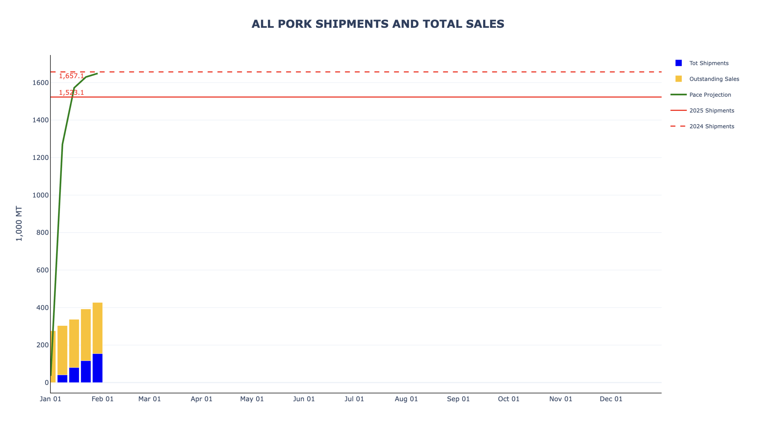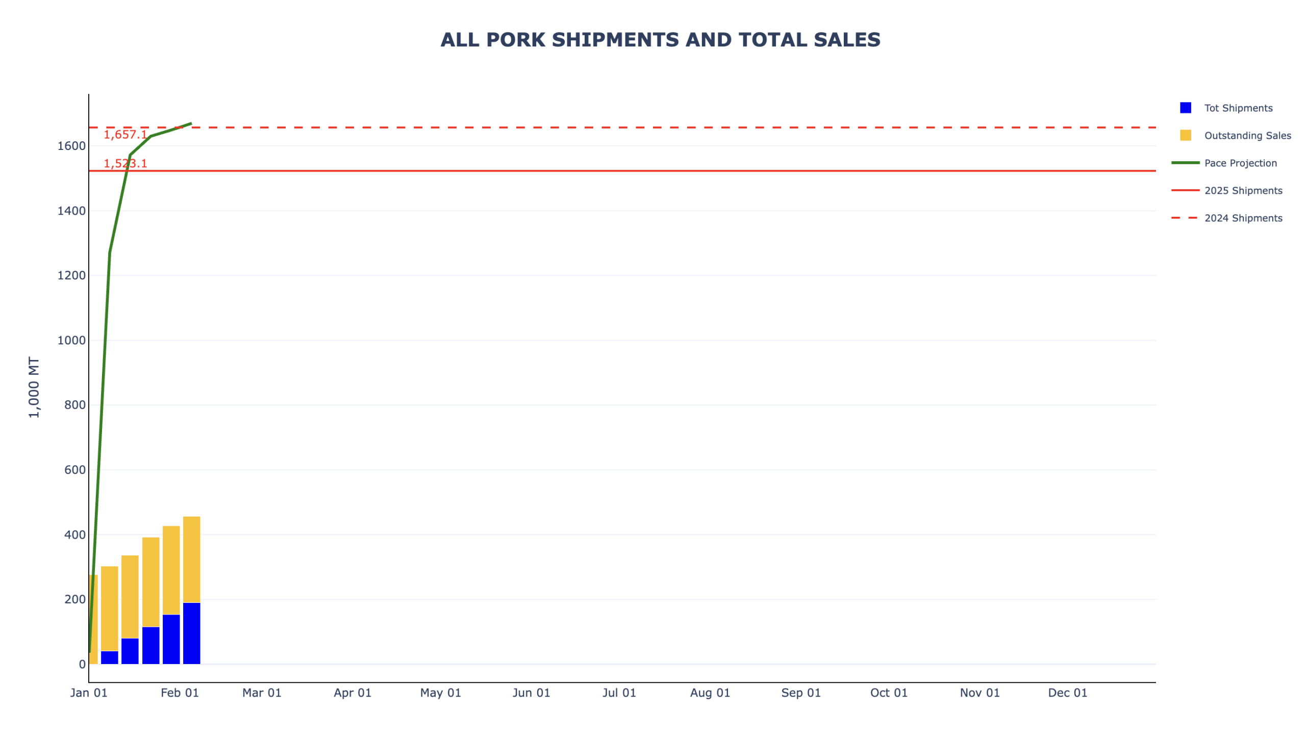 The latest weekly export sales and shipment update showed 2026 calendar-year export shipments of U.S. pork at 153.8 1,000 MT (blue column) through Thursday, January 29, a point in the [...]