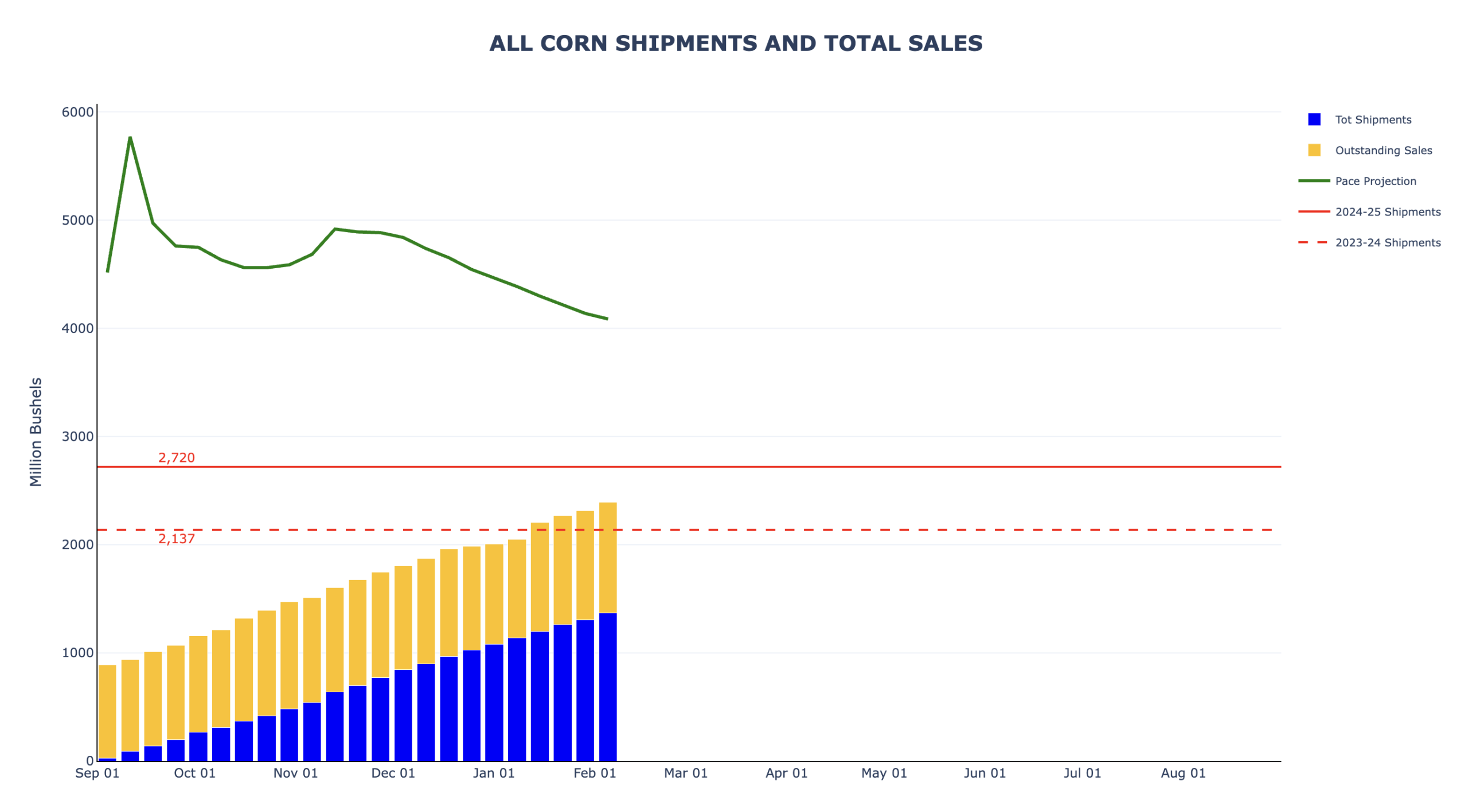 The latest weekly export sales and shipment update showed 2025-2026 marketing year export shipments of U.S. Corn at 1,367 mb (blue column) through Thursday, February 05, a point in the [...]