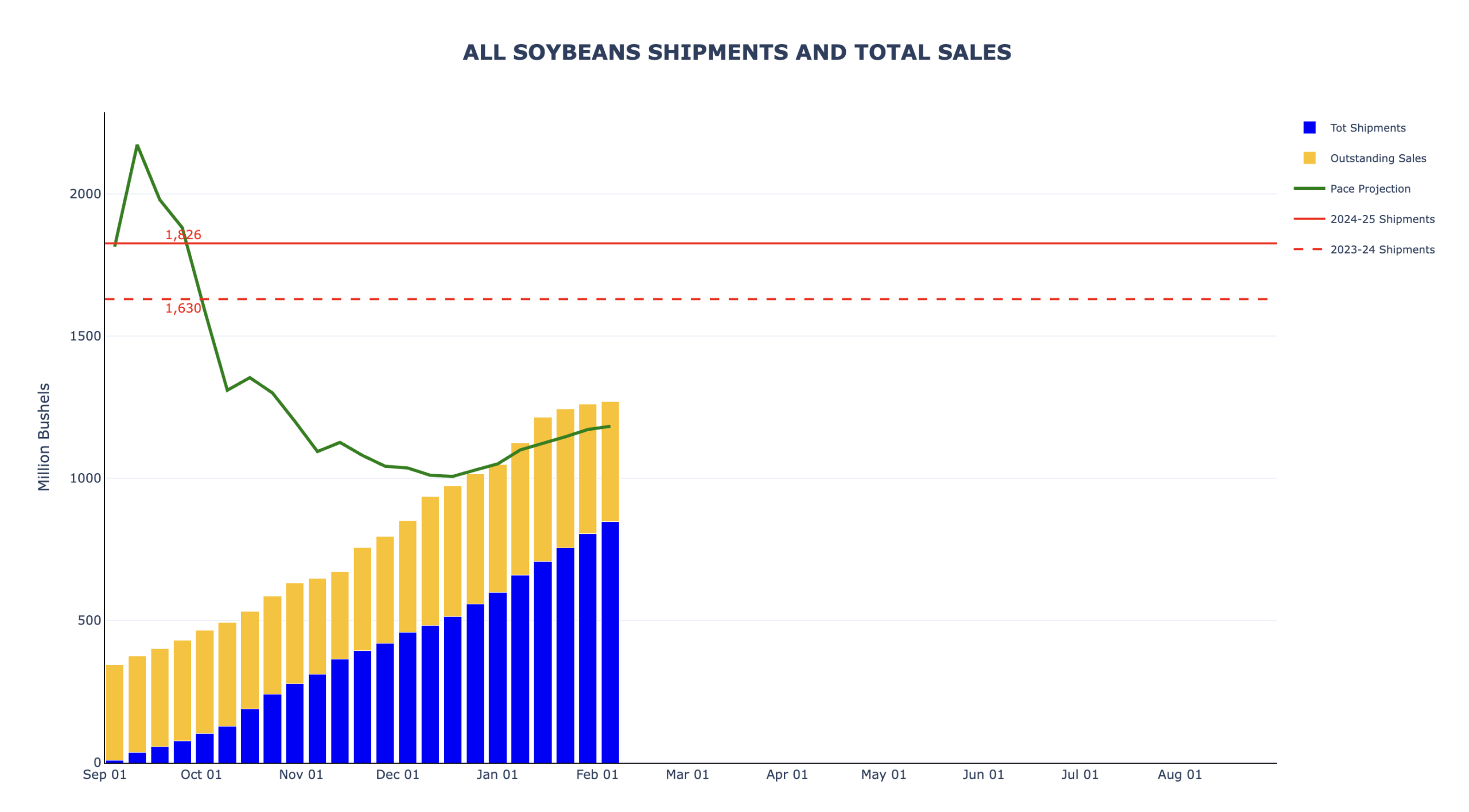 The latest weekly export sales and shipment update showed 2025-2026 marketing year export shipments of U.S. soybeans at 847 mb (blue column) through Thursday, February 05, a point in the [...]