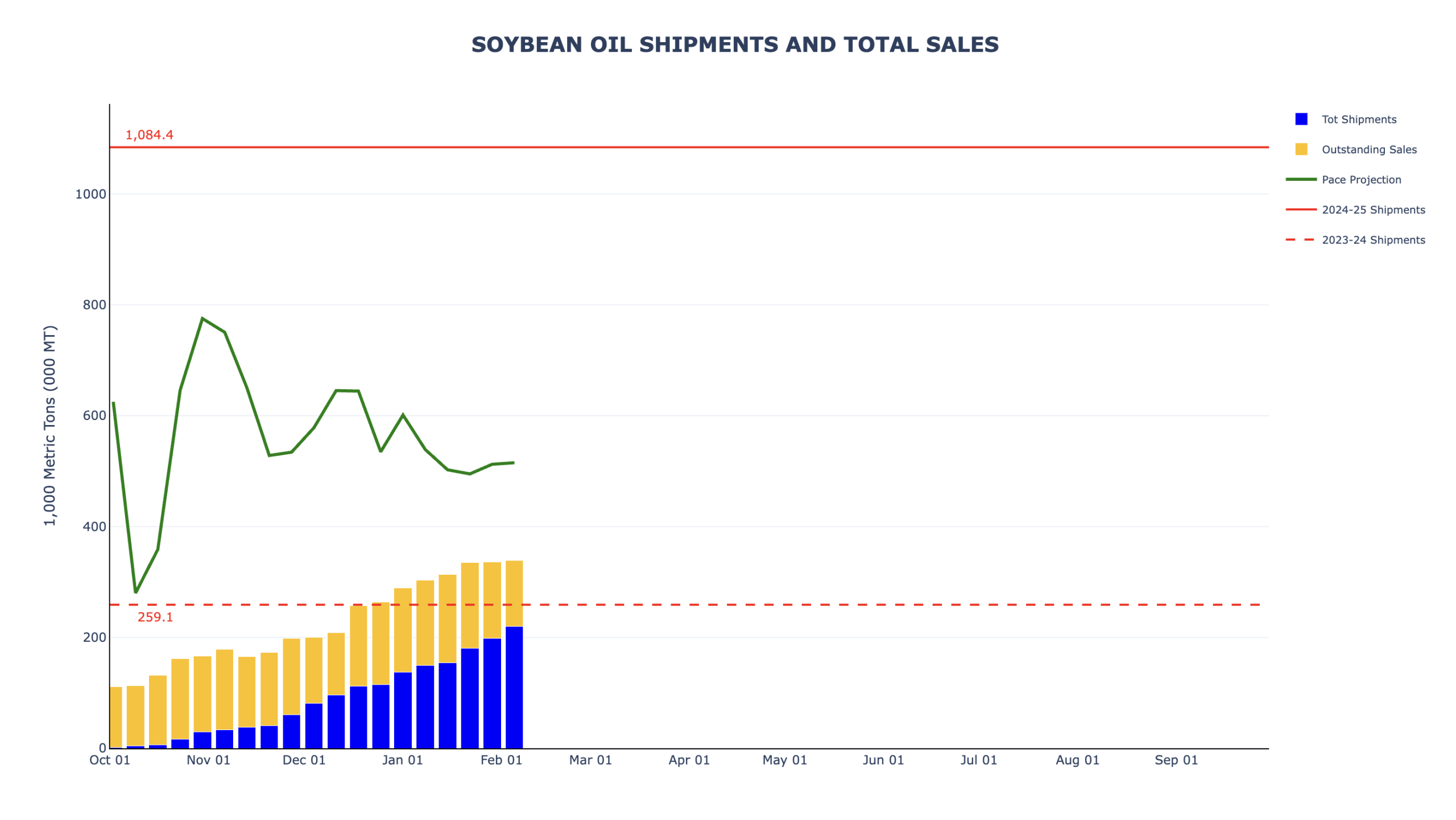 The latest weekly export sales and shipment update showed 2025-2026 marketing year export shipments of U.S. soybean oil at 219.4 (1,000 mt) (blue column) through Thursday, February 05, a point [...]