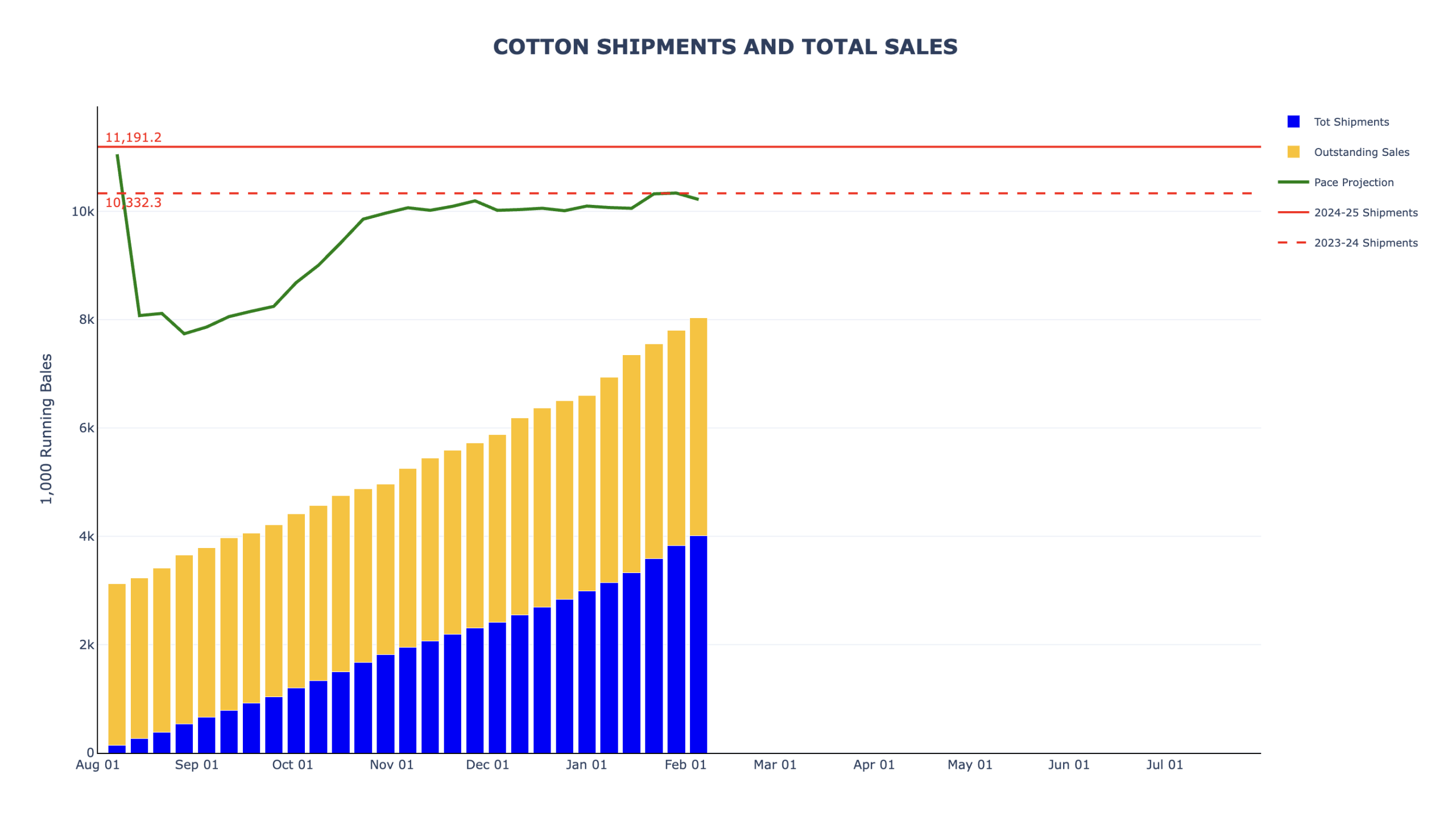 The latest weekly export sales and shipment update showed 2025-2026 marketing year export shipments of U.S. upland cotton at 3,822.6 (1,000 running bales) (blue column) through Thursday, January 29, a [...]