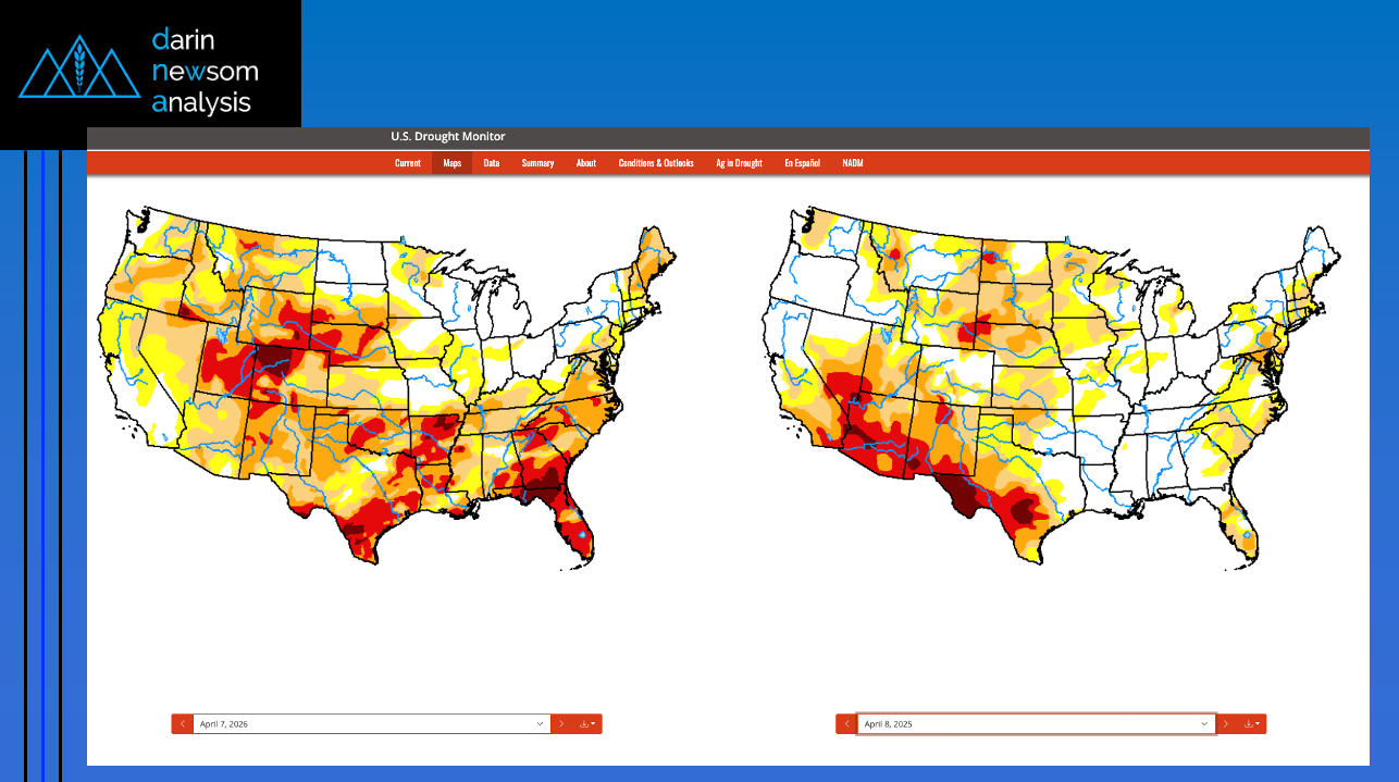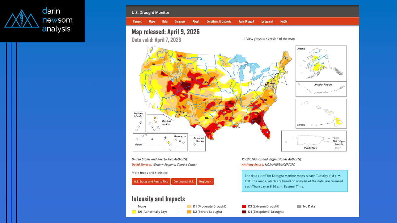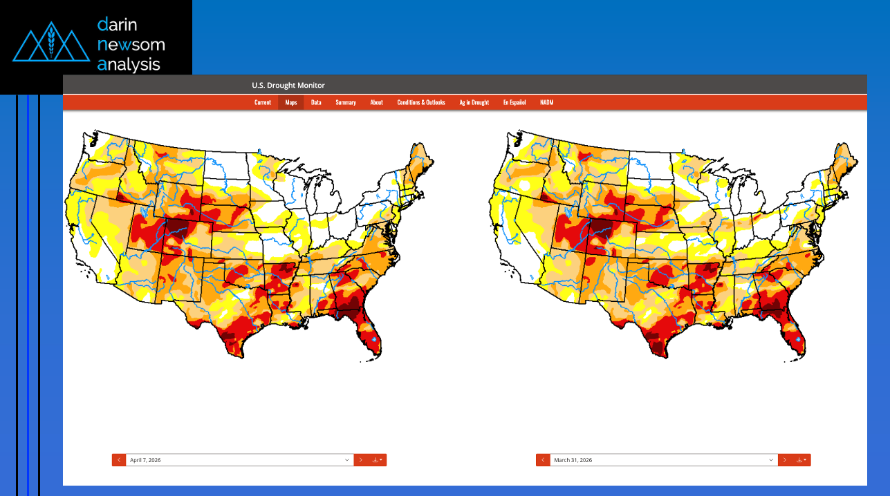 The latest weekly US Drought Monitor update, for the week ending Tuesday, April 7 (slide 1) showed drought readings little changed across the Plains while improving slightly again over the [...]