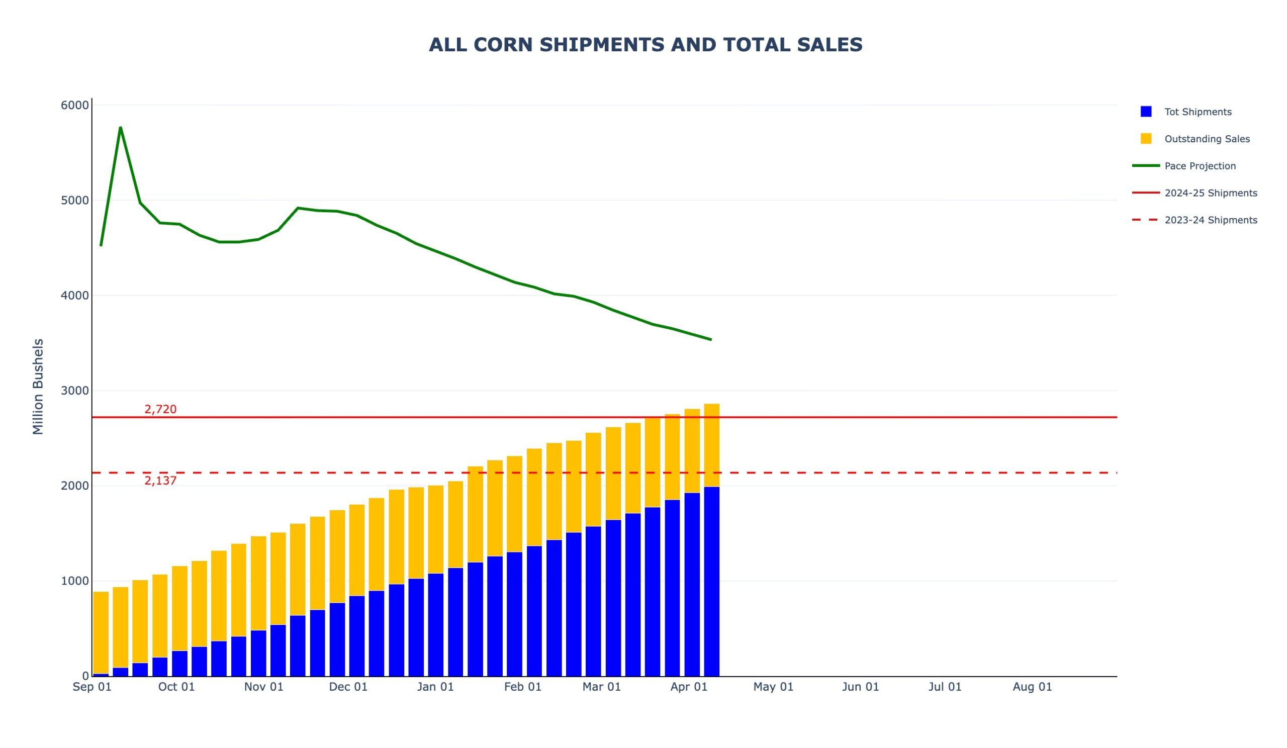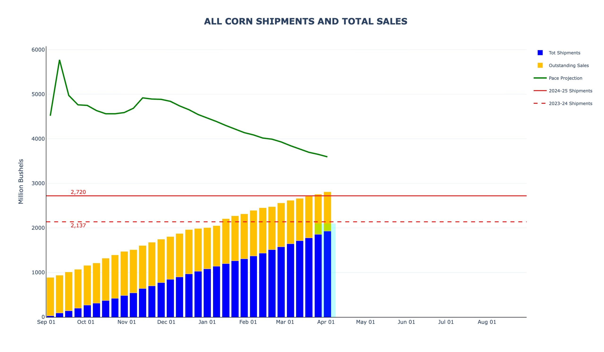 The latest weekly export sales and shipment update showed 2025-2026 marketing year export shipments of U.S. Corn at 1,989 mb (blue column) through Thursday, April 09, a point in the [...]