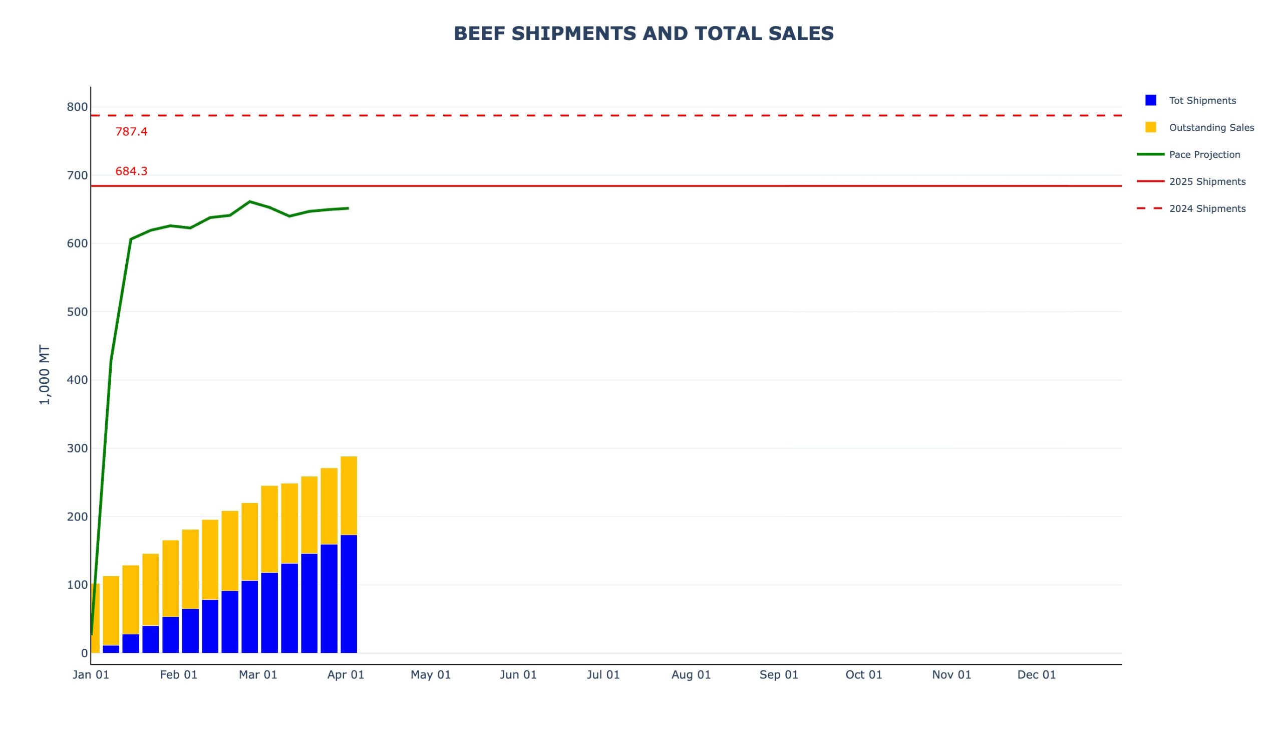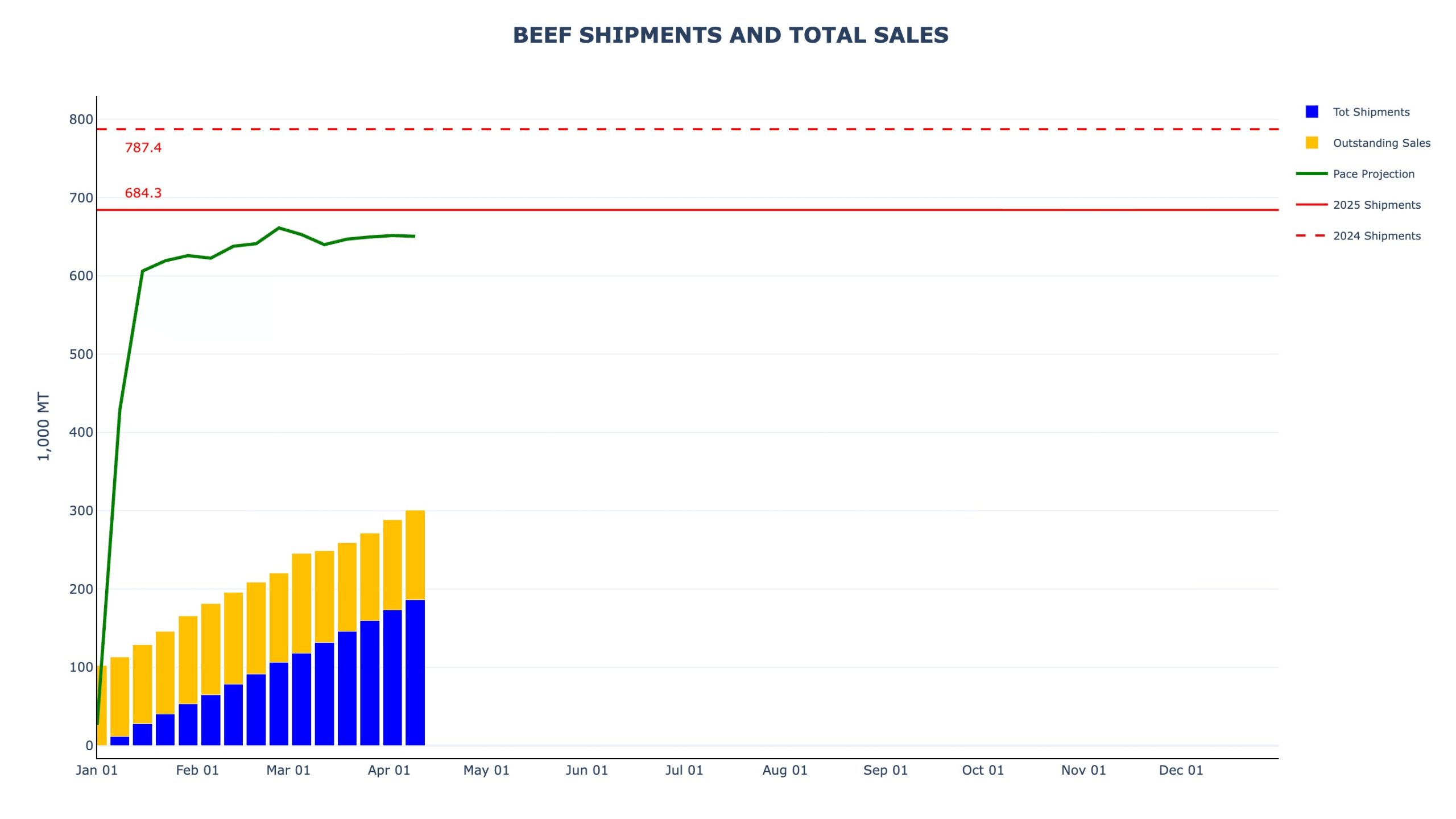 The latest weekly export sales and shipment update showed 2026 calendar-year export shipments of U.S. beef at 172.9 1,000 MT (blue column) through Thursday, April 02, a point in the [...]