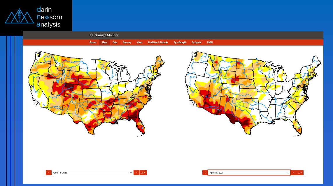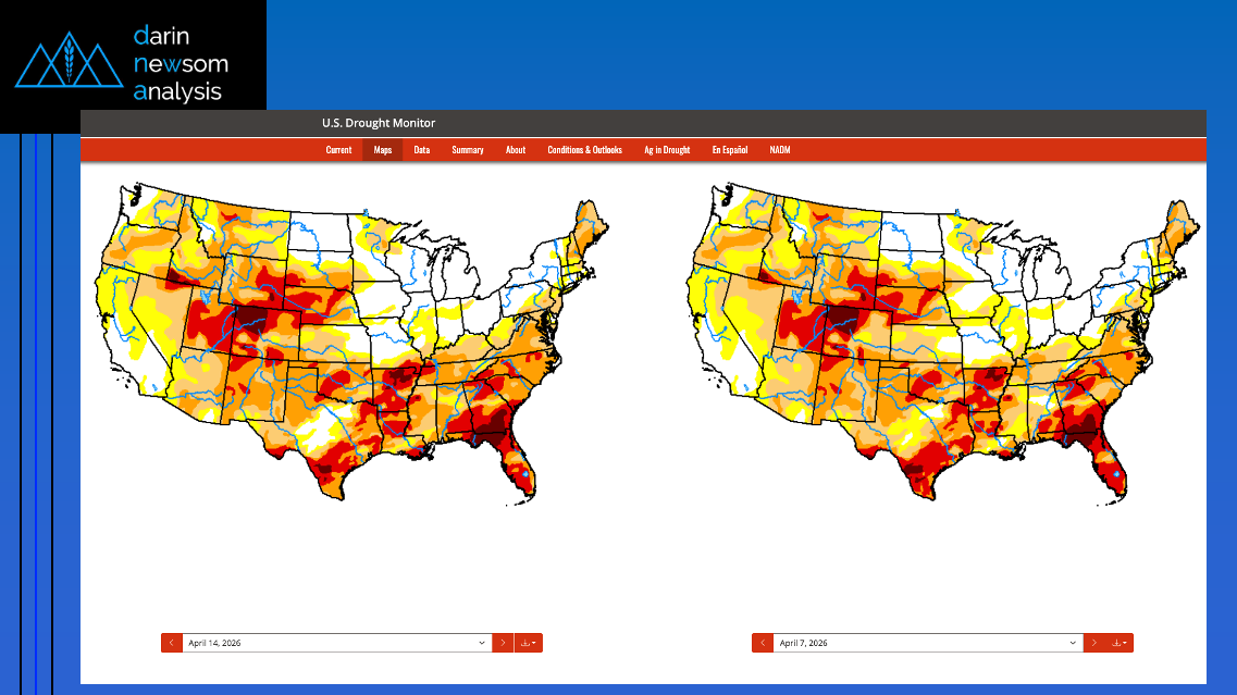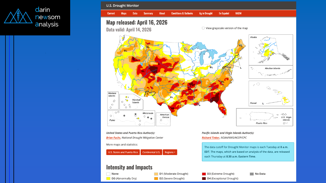 The latest weekly US Drought Monitor update, for the week ending Tuesday, April 14 (slide 1) showed drought readings little changed across the Plains while improving slightly again over the [...]