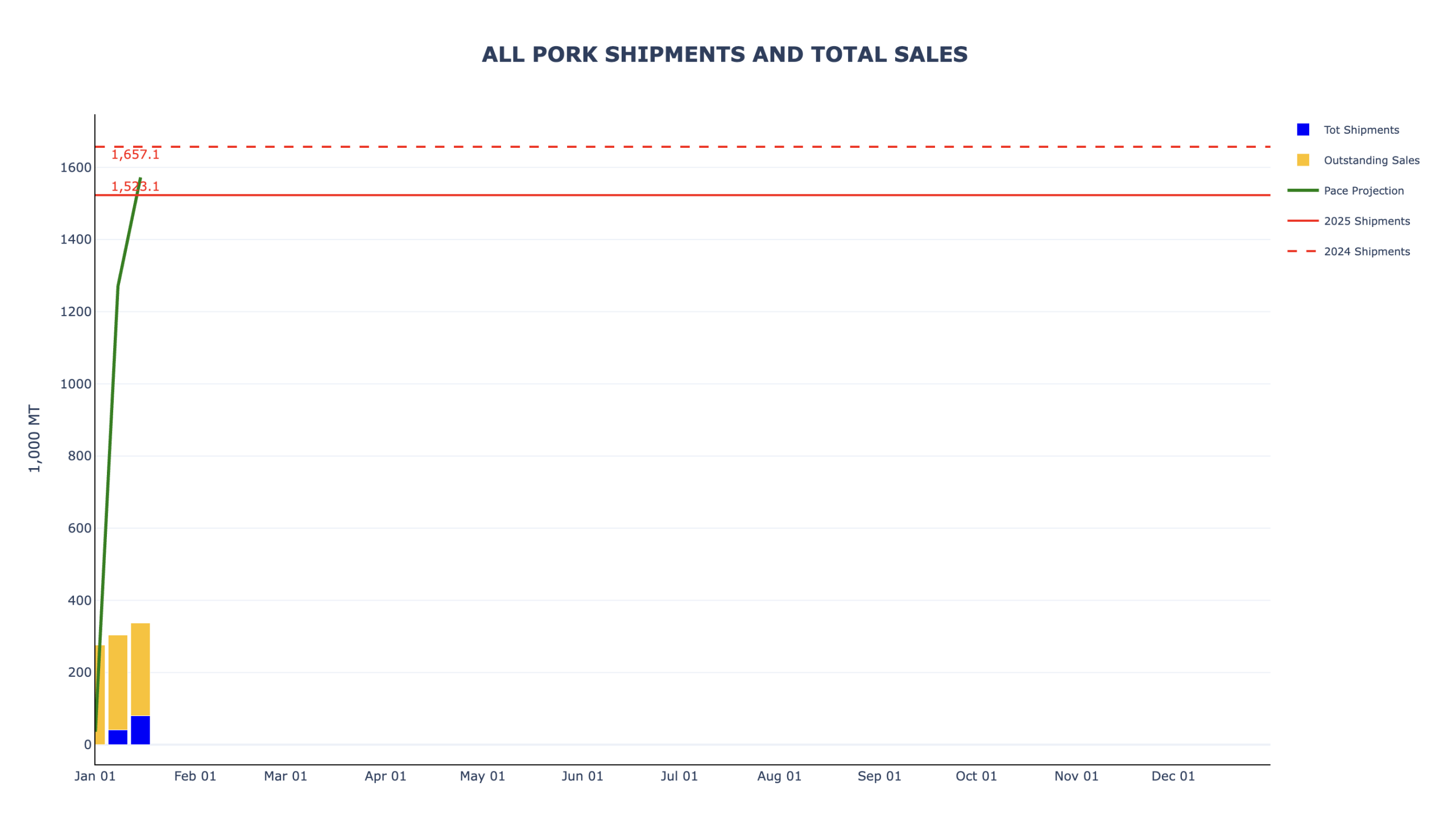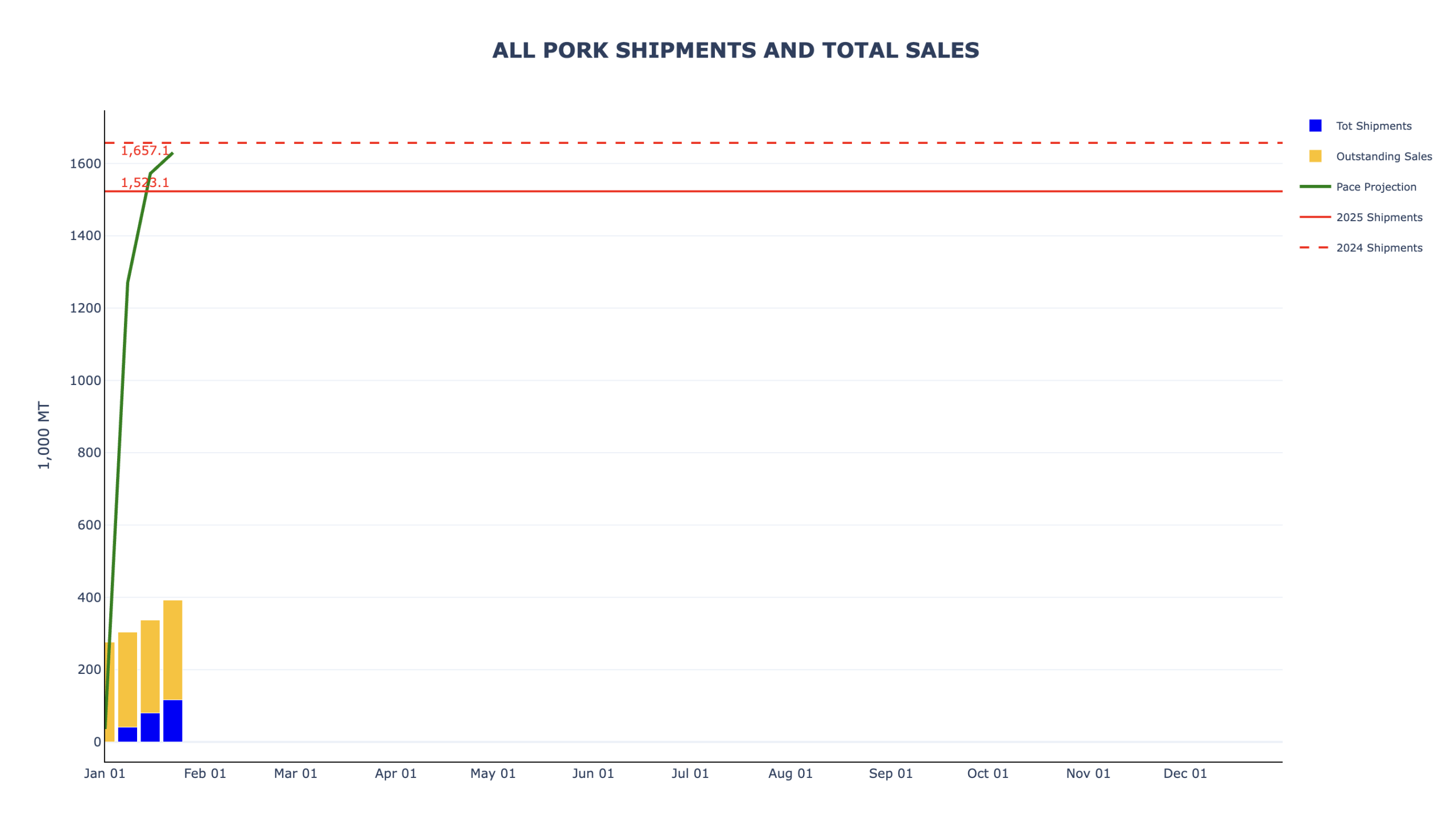 The latest weekly export sales and shipment update showed 2026 calendar-year export shipments of U.S. pork at 80.3 1,000 MT (blue column) through Thursday, January 15, a point in the [...]