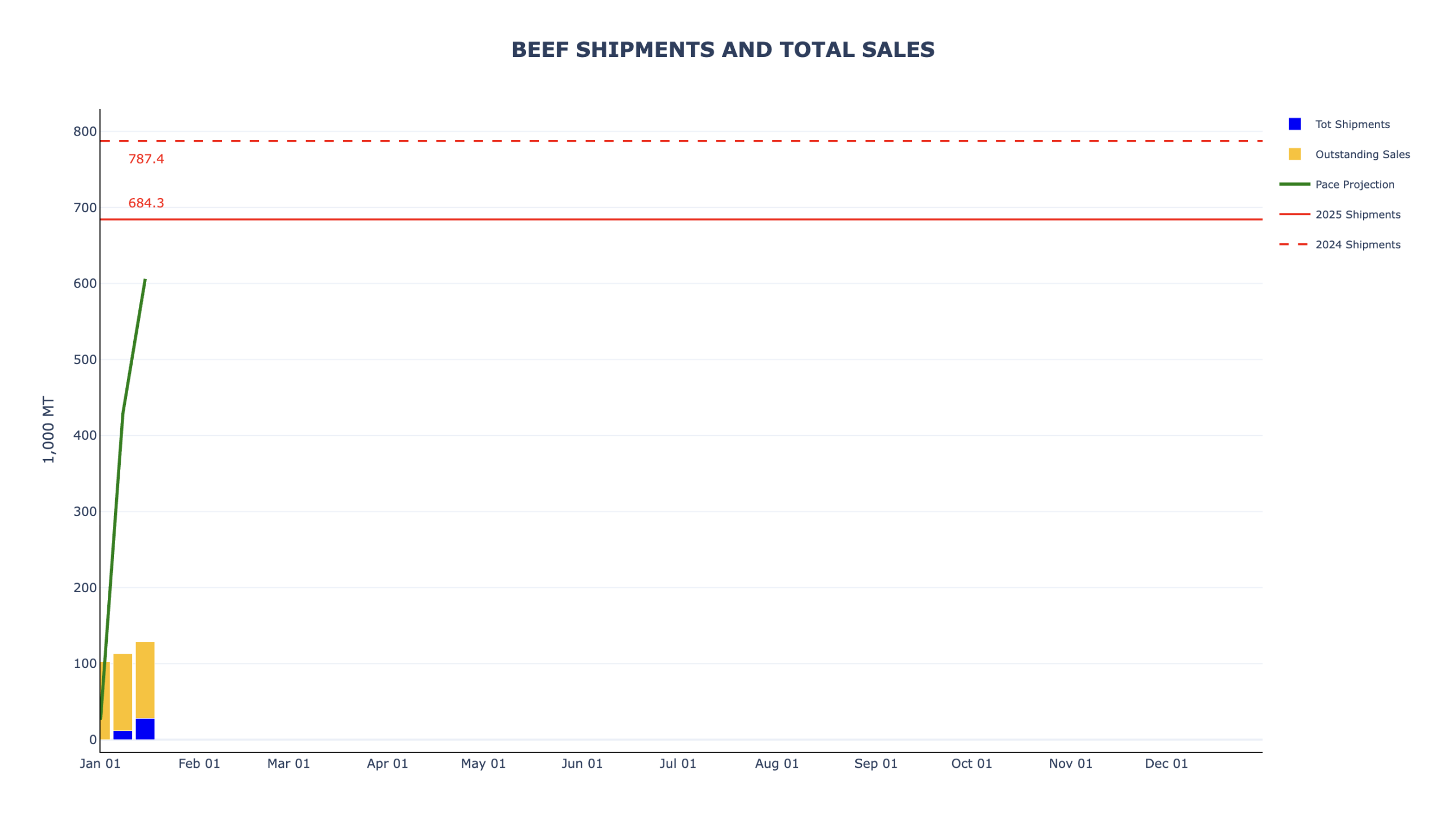 The latest weekly export sales and shipment update showed 2026 calendar-year export shipments of U.S. beef at 27.8 1,000 MT (blue column) through Thursday, January 15, a point in the [...]