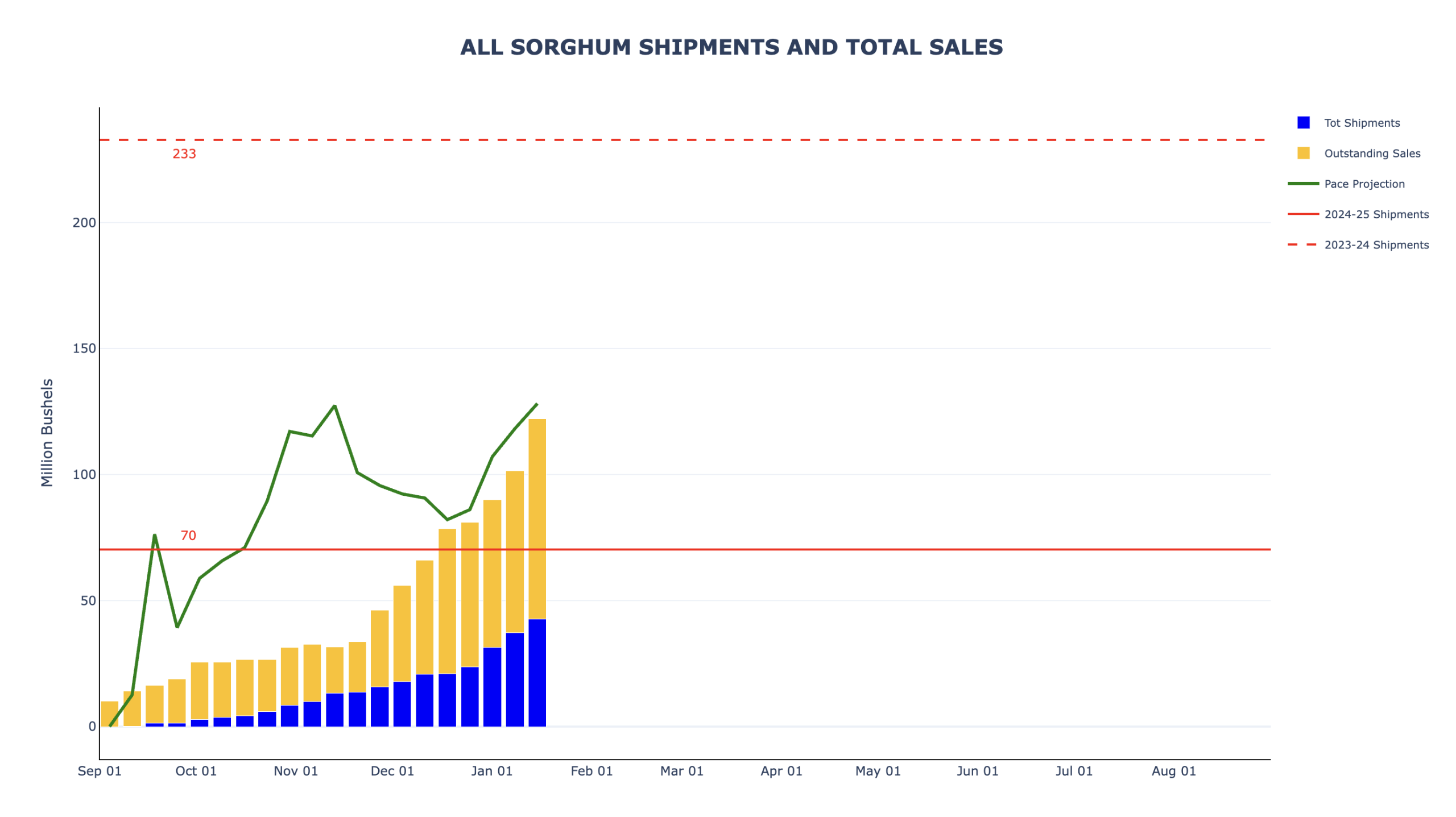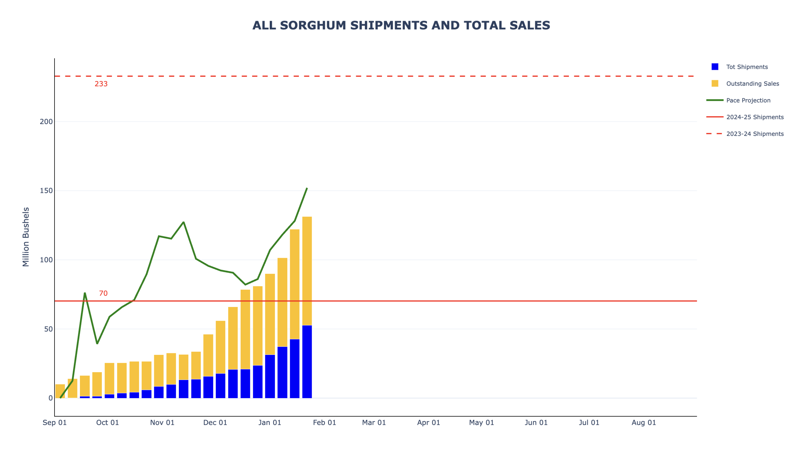 The latest weekly export sales and shipment update showed 2025-2026 marketing year export shipments of U.S. sorghum at 53 mb (blue column) through Thursday, January 22, a point in the [...]