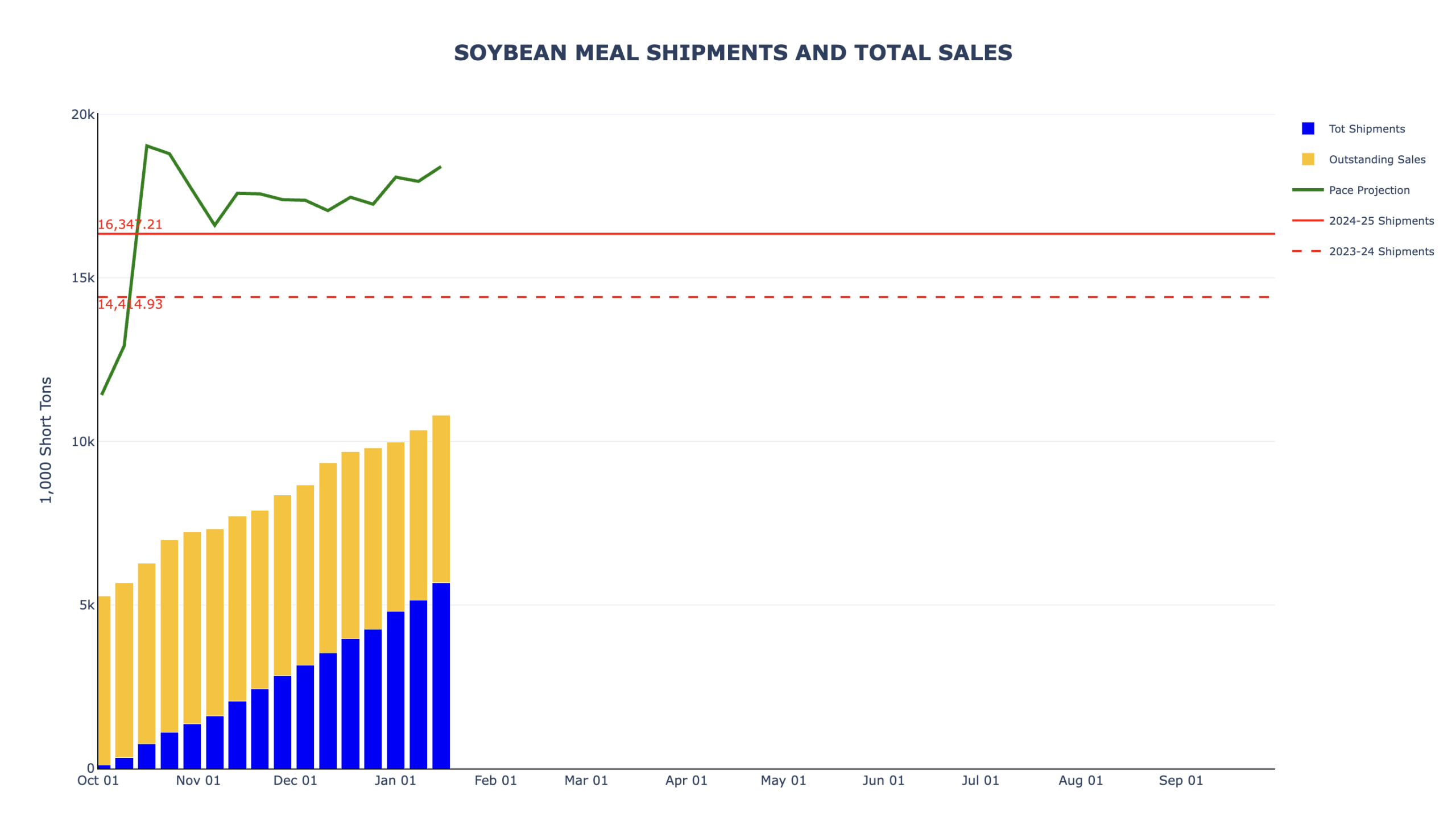 The latest weekly export sales and shipment update showed 2025-2026 marketing year export shipments of U.S. soybean meal at 6,045.63 (1,000 st) (blue column) through Thursday, January 22, a point [...]