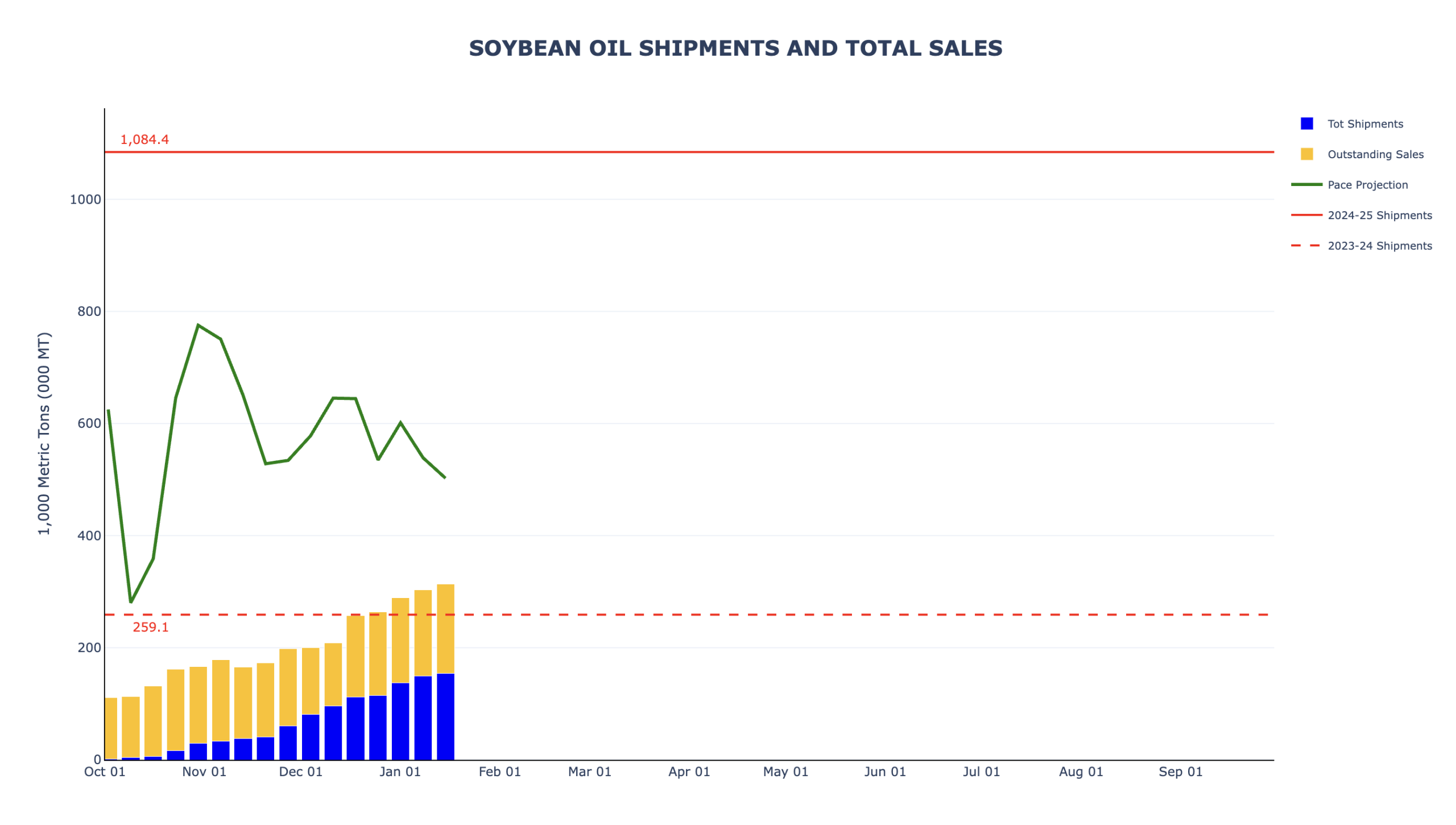 The latest weekly export sales and shipment update showed 2025-2026 marketing year export shipments of U.S. soybean oil at 154.2 (1,000 mt) (blue column) through Thursday, January 15, a point [...]