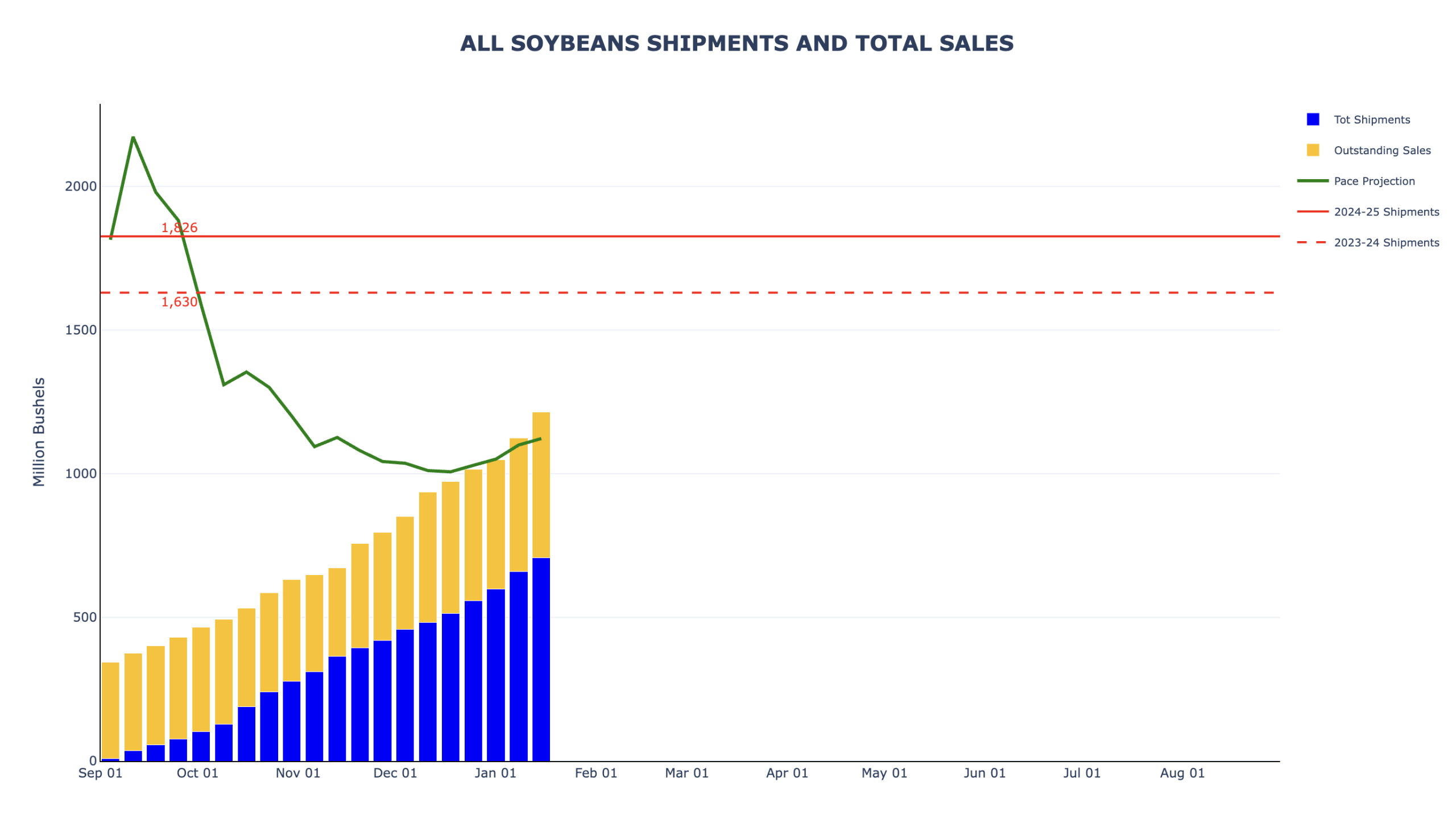 The latest weekly export sales and shipment update showed 2025-2026 marketing year export shipments of U.S. soybeans at 708 mb (blue column) through Thursday, January 15, a point in the [...]