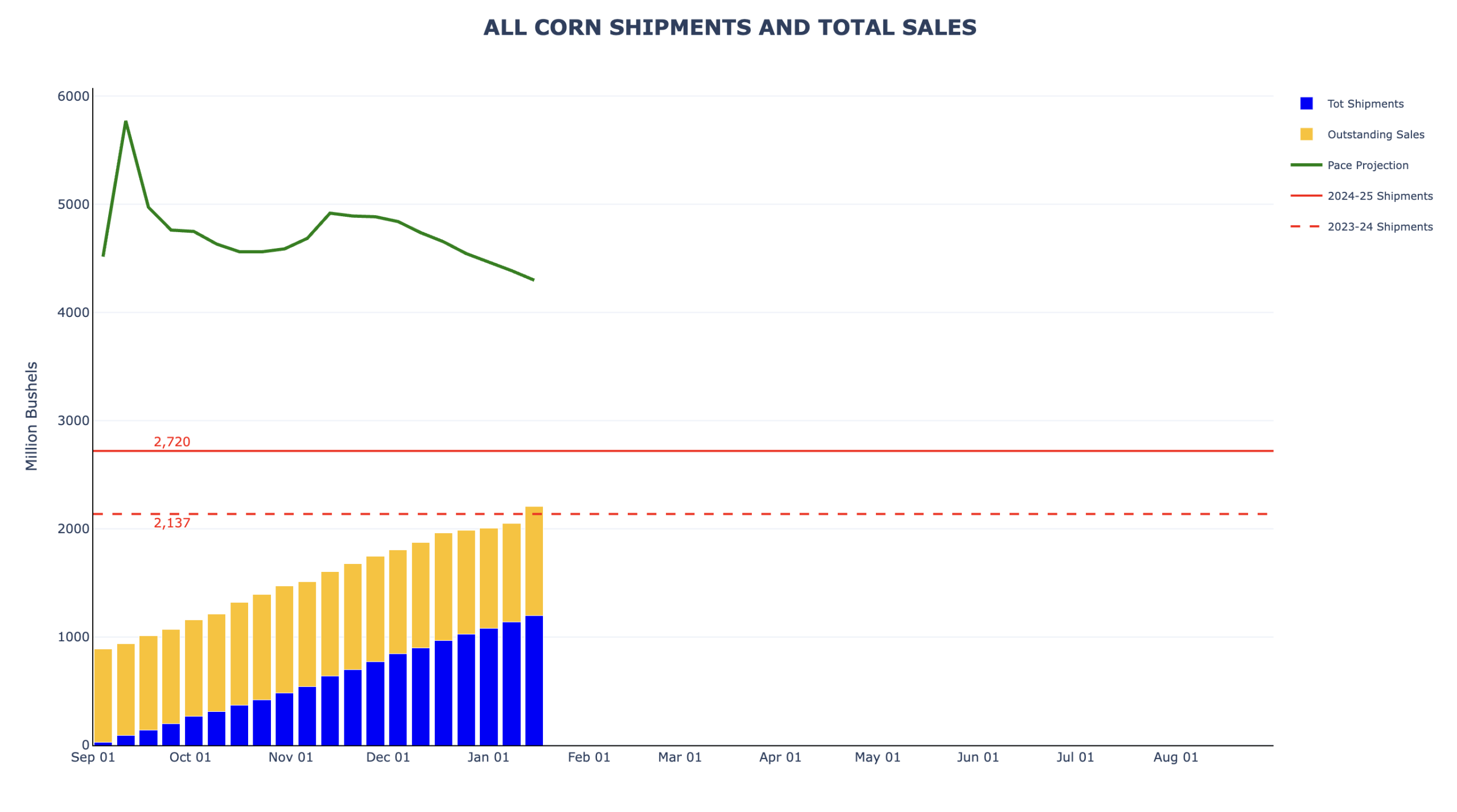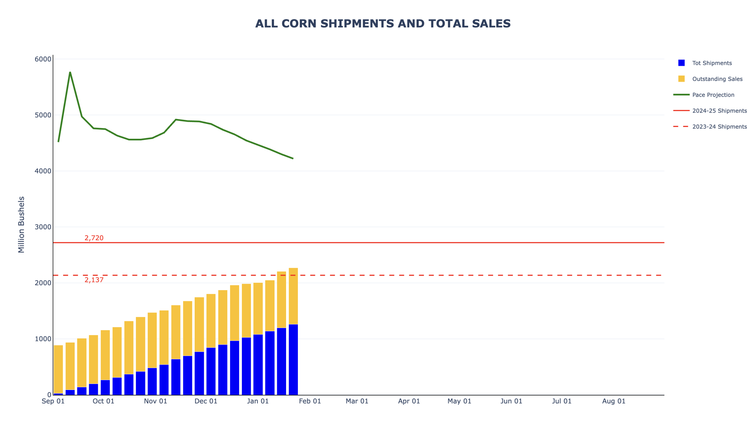The latest weekly export sales and shipment update showed 2025-2026 marketing year export shipments of U.S. Corn at 1,263 mb (blue column) through Thursday, January 22, a point in the [...]