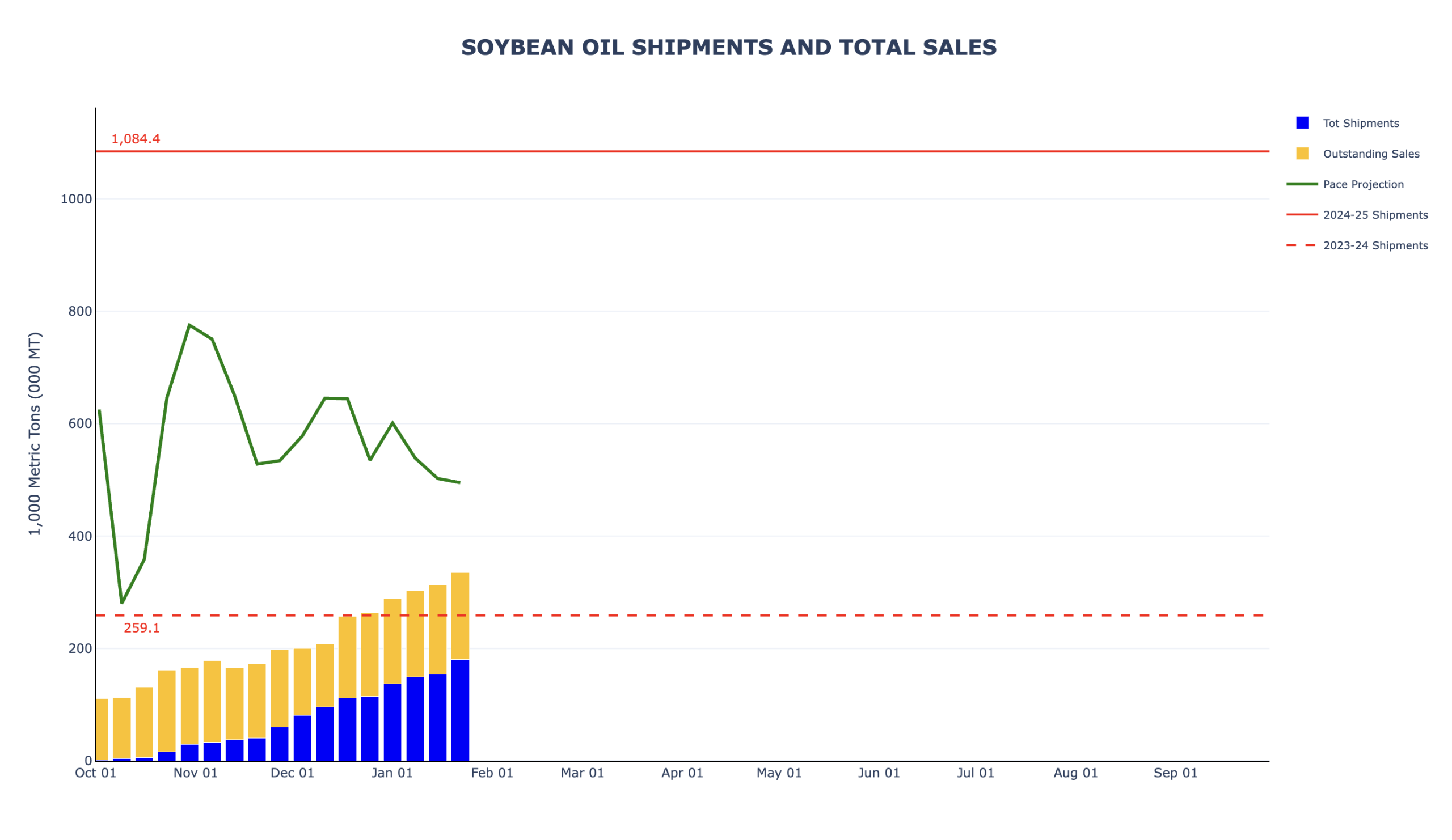The latest weekly export sales and shipment update showed 2025-2026 marketing year export shipments of U.S. soybean oil at 180.7 (1,000 mt) (blue column) through Thursday, January 22, a point [...]