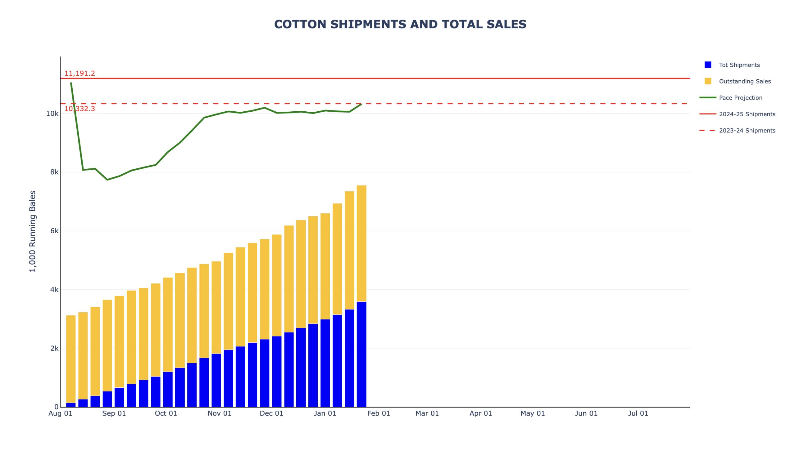 The latest weekly export sales and shipment update showed 2025-2026 marketing year export shipments of U.S. upland cotton at 3,330.2 (1,000 running bales) (blue column) through Thursday, January 15, a [...]