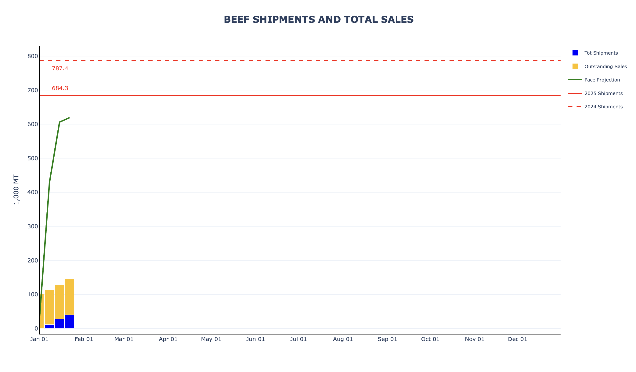 The latest weekly export sales and shipment update showed 2026 calendar-year export shipments of U.S. beef at 40.3 1,000 MT (blue column) through Thursday, January 22, a point in the [...]