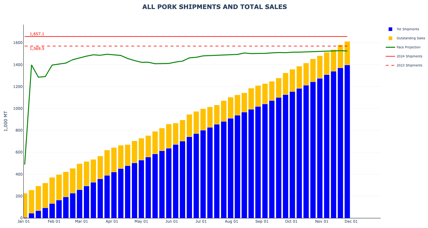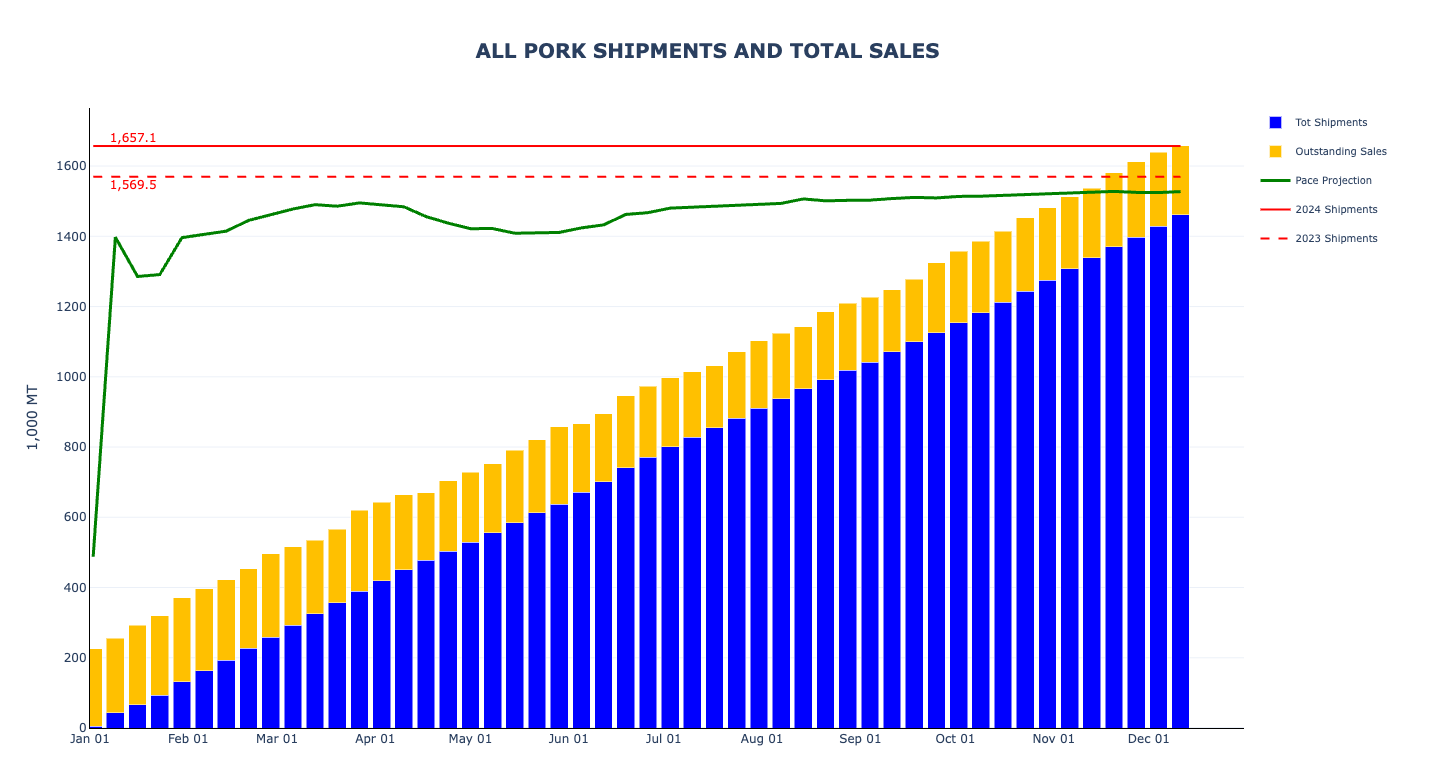 The latest weekly export sales and shipment update showed 2025 calendar-year export shipments of U.S. pork at 1,462.1 1,000 MT (blue column) through Thursday, December 11, a point in the [...]