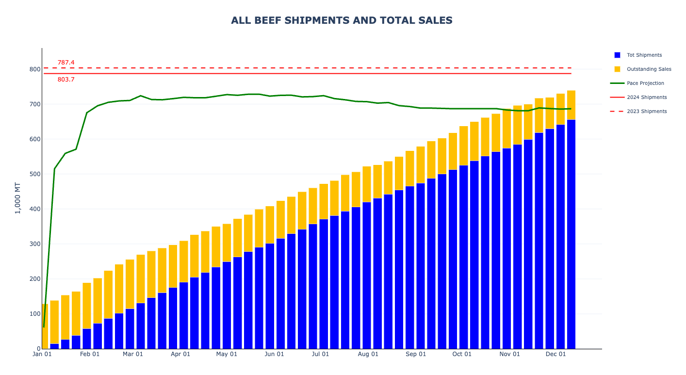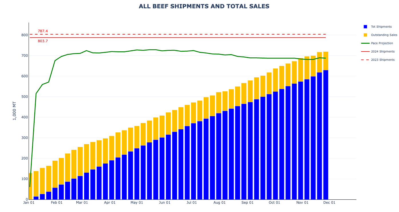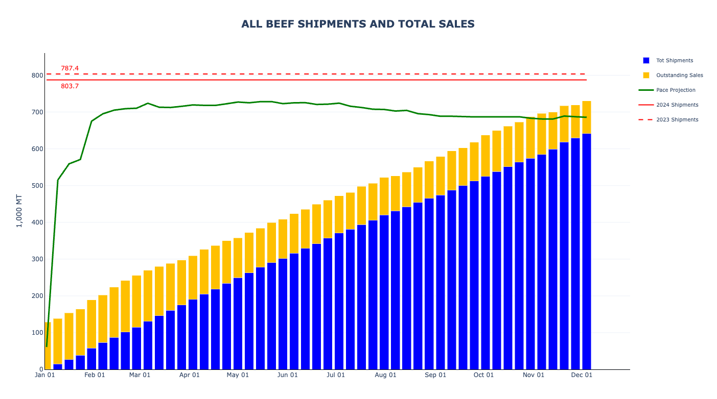 The latest weekly export sales and shipment update showed 2025 calendar-year export shipments of U.S. beef at 629.5 1,000 MT (blue column) through Thursday, November 27, a point in the [...]