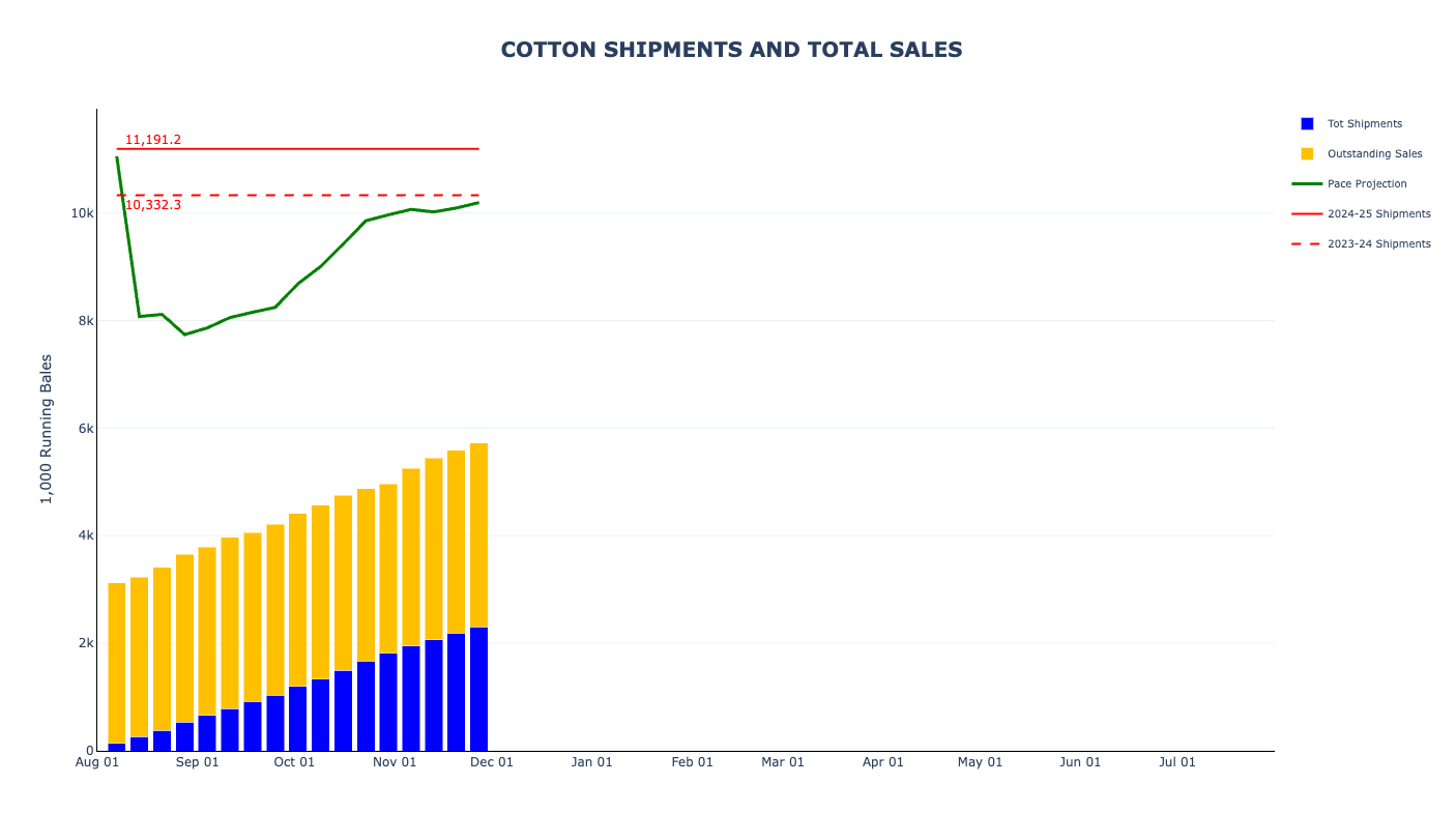 The latest weekly export sales and shipment update showed 2025-2026 marketing year export shipments of U.S. upland cotton at 2,308.7 (1000 running bales) (blue column) through Thursday, November 27, a [...]