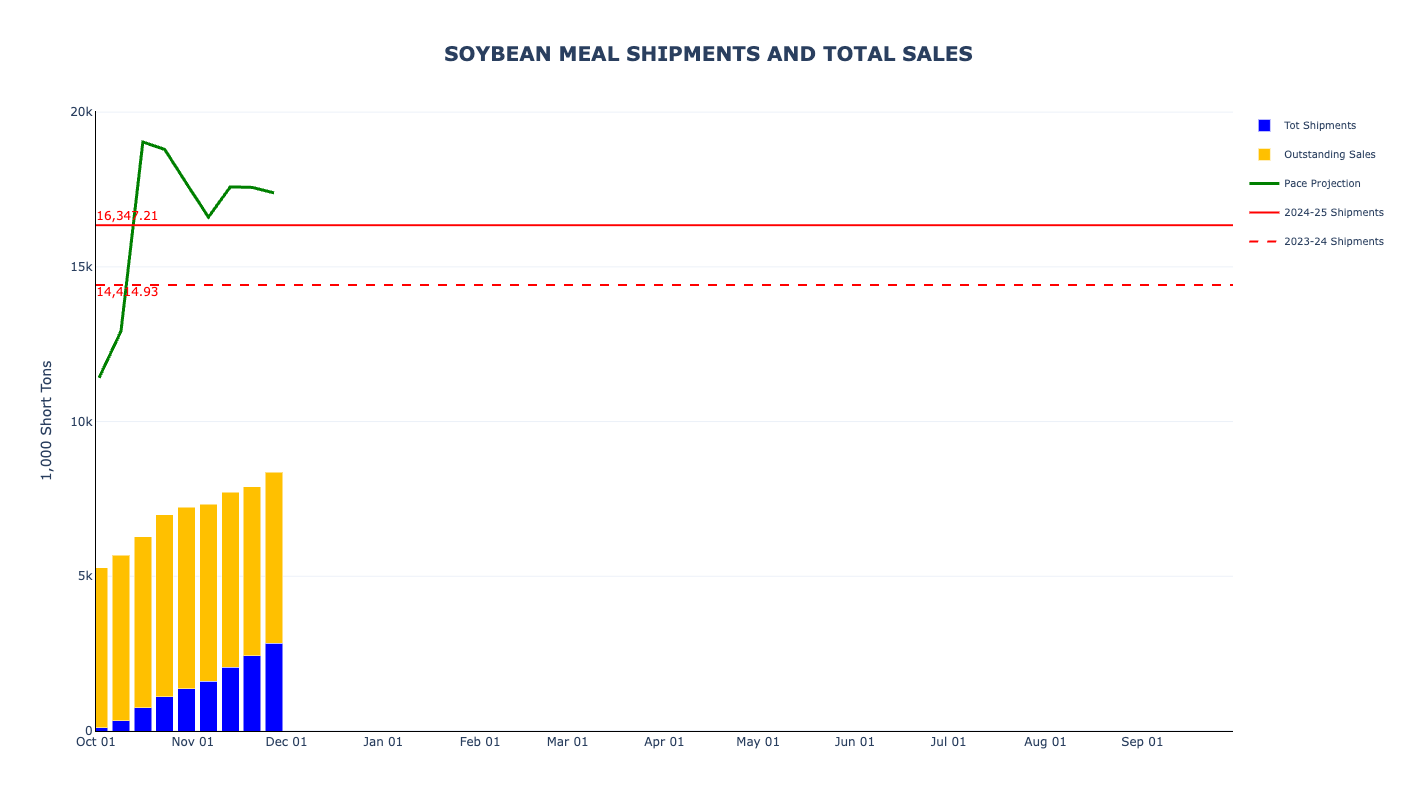 The latest weekly export sales and shipment update showed 2025-2026 marketing year export shipments of U.S. soybean meal at 2,841.70 (1,000 st) (blue column) through Thursday, November 27, a point [...]
