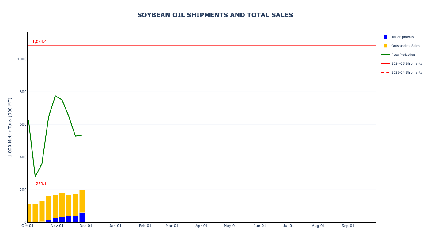 The latest weekly export sales and shipment update showed 2025-2026 marketing year export shipments of U.S. soybean oil at 60.2 (1000 mt) (blue column) through Thursday, November 27, a point [...]