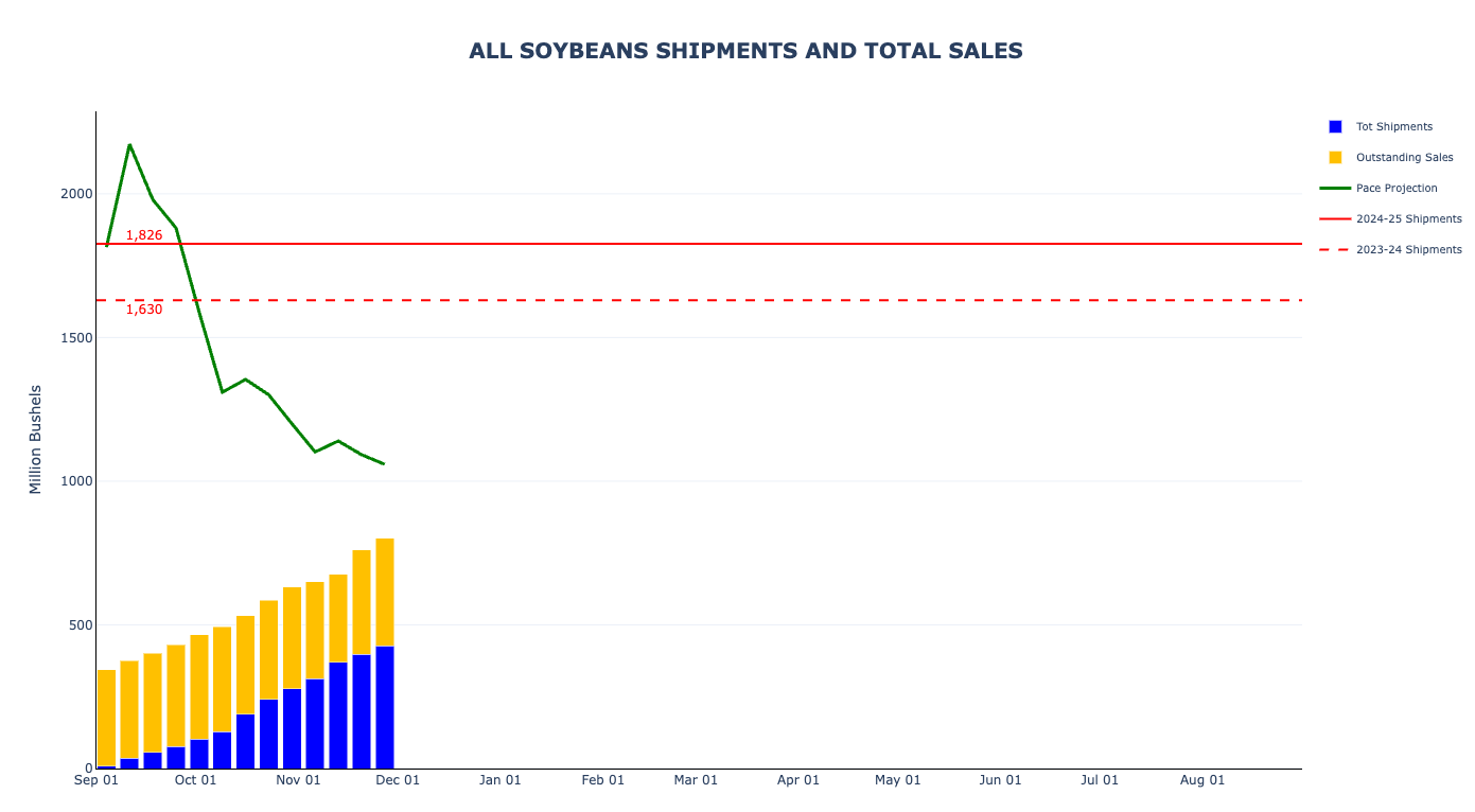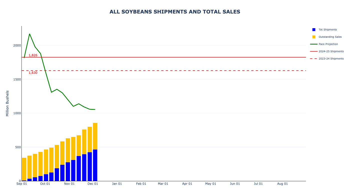 The latest weekly export sales and shipment update showed 2025-2026 marketing year export shipments of U.S. soybeans at 427 mb (blue column) through Thursday, November 27, a point in the [...]