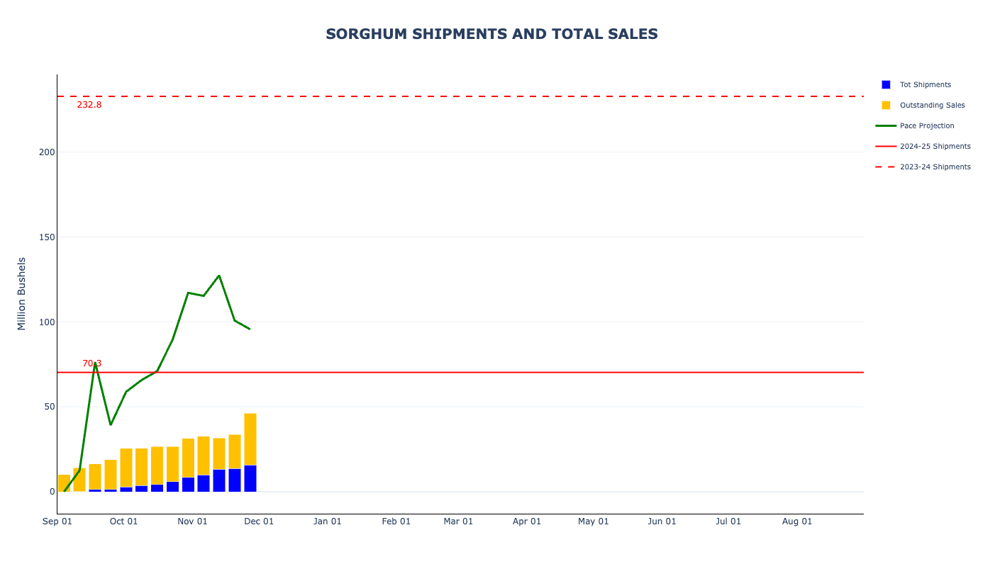 The latest weekly export sales and shipment update showed 2025-2026 marketing year export shipments of U.S. sorghum at 18 mb (blue column) through Thursday, December 04, a point in the [...]
