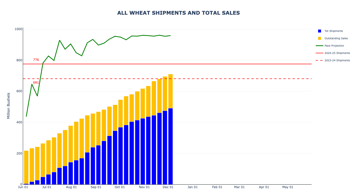 The latest weekly export sales and shipment update showed 2025-2026 marketing year export shipments of all U.S. Wheat at 490 mb (blue column) through Thursday, December 04, a point in [...]