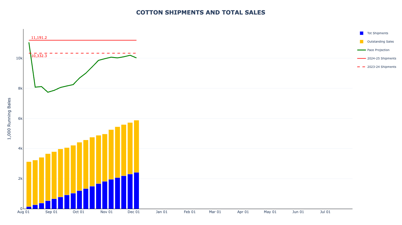 The latest weekly export sales and shipment update showed 2025-2026 marketing year export shipments of U.S. upland cotton at 2,410.3 (1000 running bales) (blue column) through Thursday, December 04, a [...]