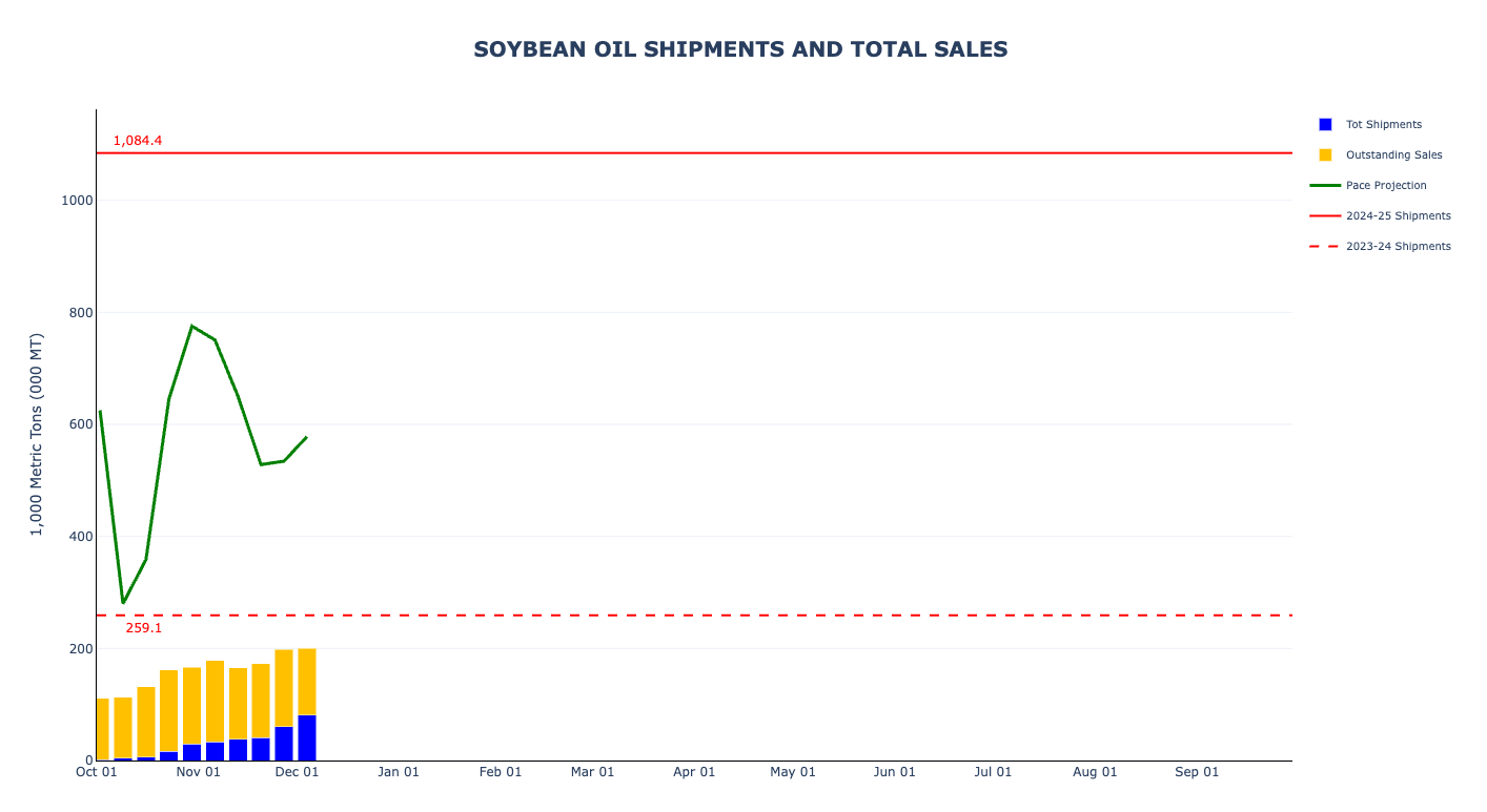 The latest weekly export sales and shipment update showed 2025-2026 marketing year export shipments of U.S. soybean oil at 81.2 (1000 mt) (blue column) through Thursday, December 04, a point [...]