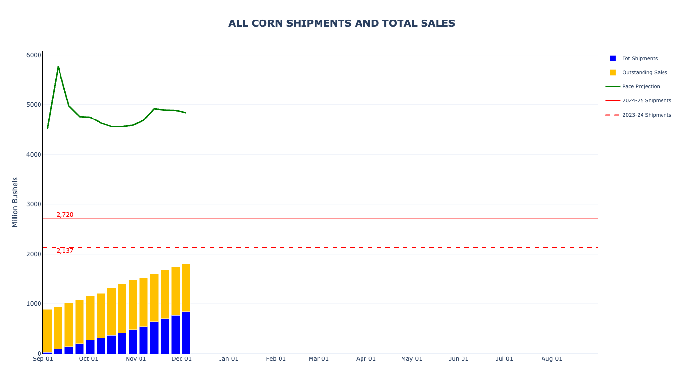 The latest weekly export sales and shipment update showed 2025-2026 marketing year export shipments of U.S. corn at 843 mb (blue column) through Thursday, December 04, a point in the [...]