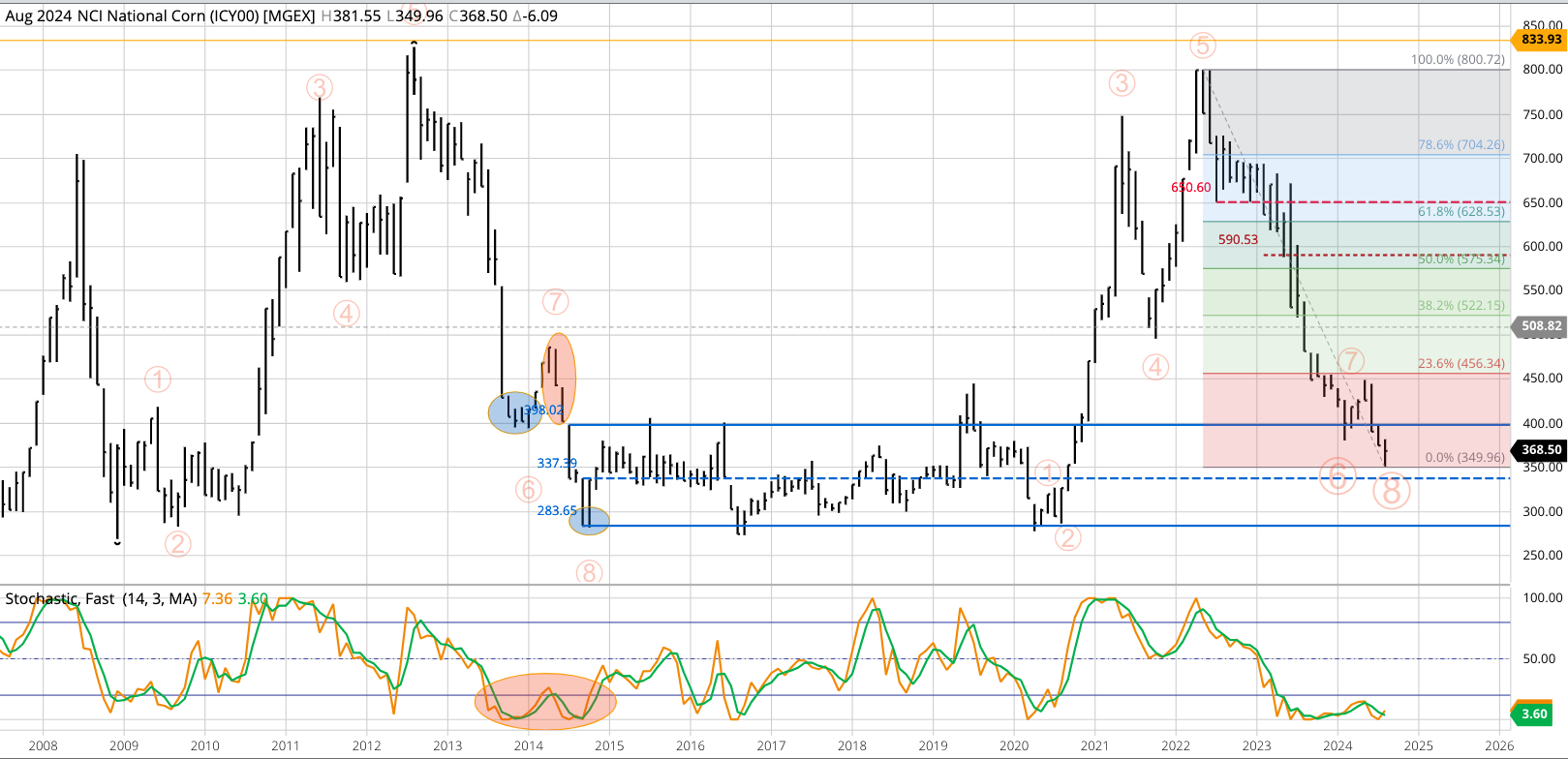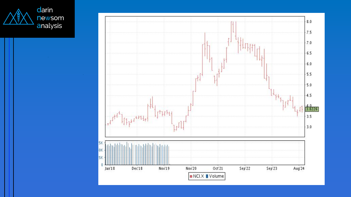 Corn Cash Index: The National Corn Index (NCI, national average cash price) extended its major (long-term) downtrend to a low of $3.50 during August before closing the month at $3.6850, [...]