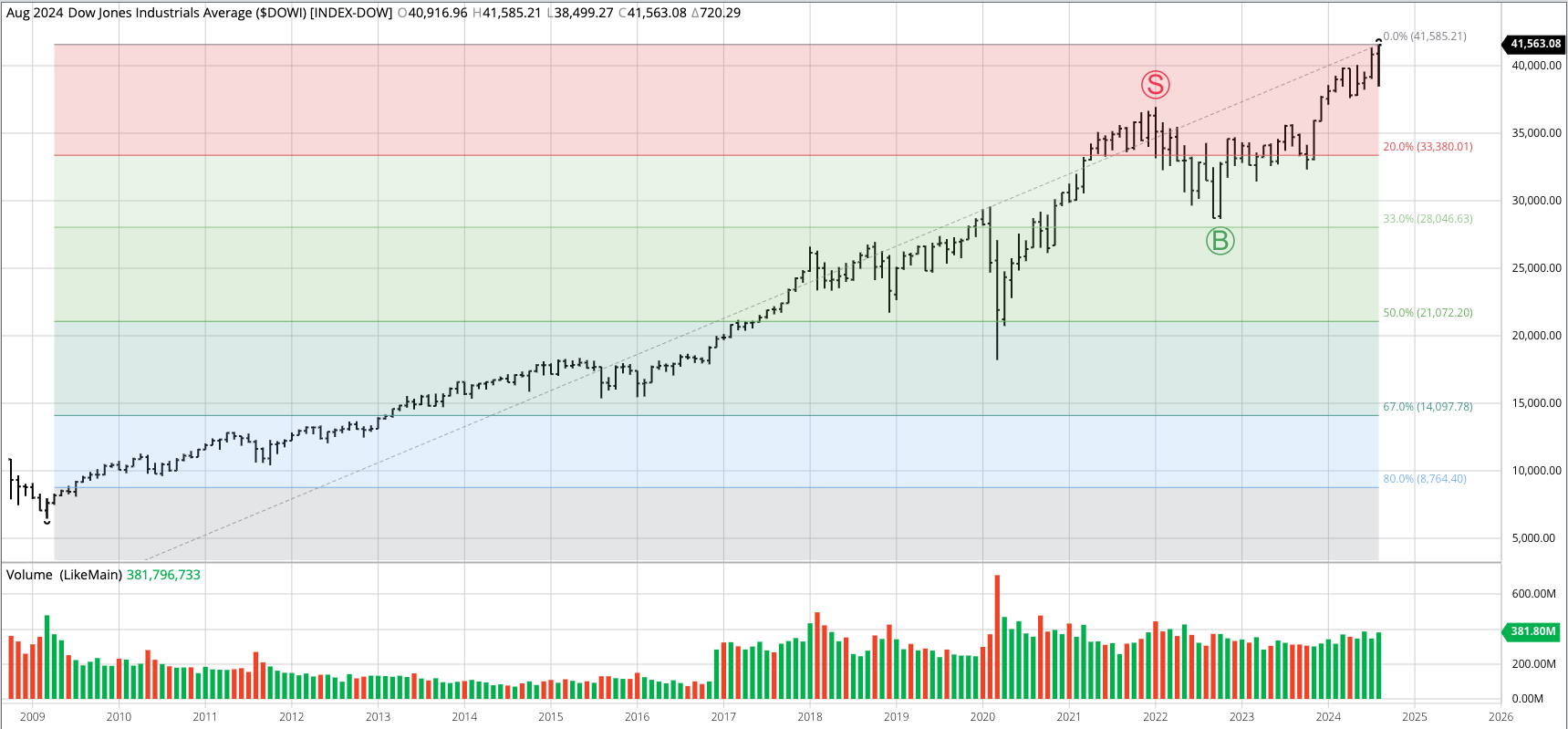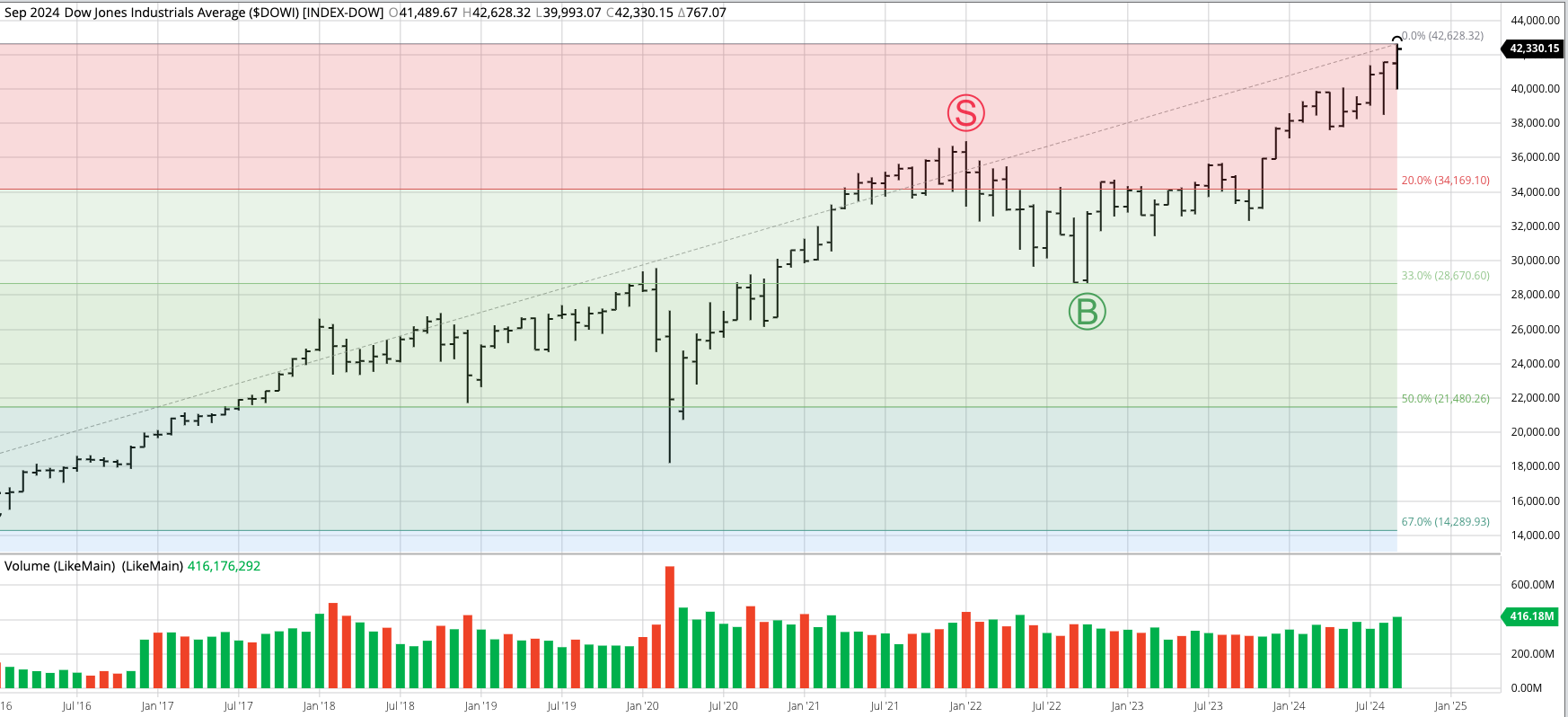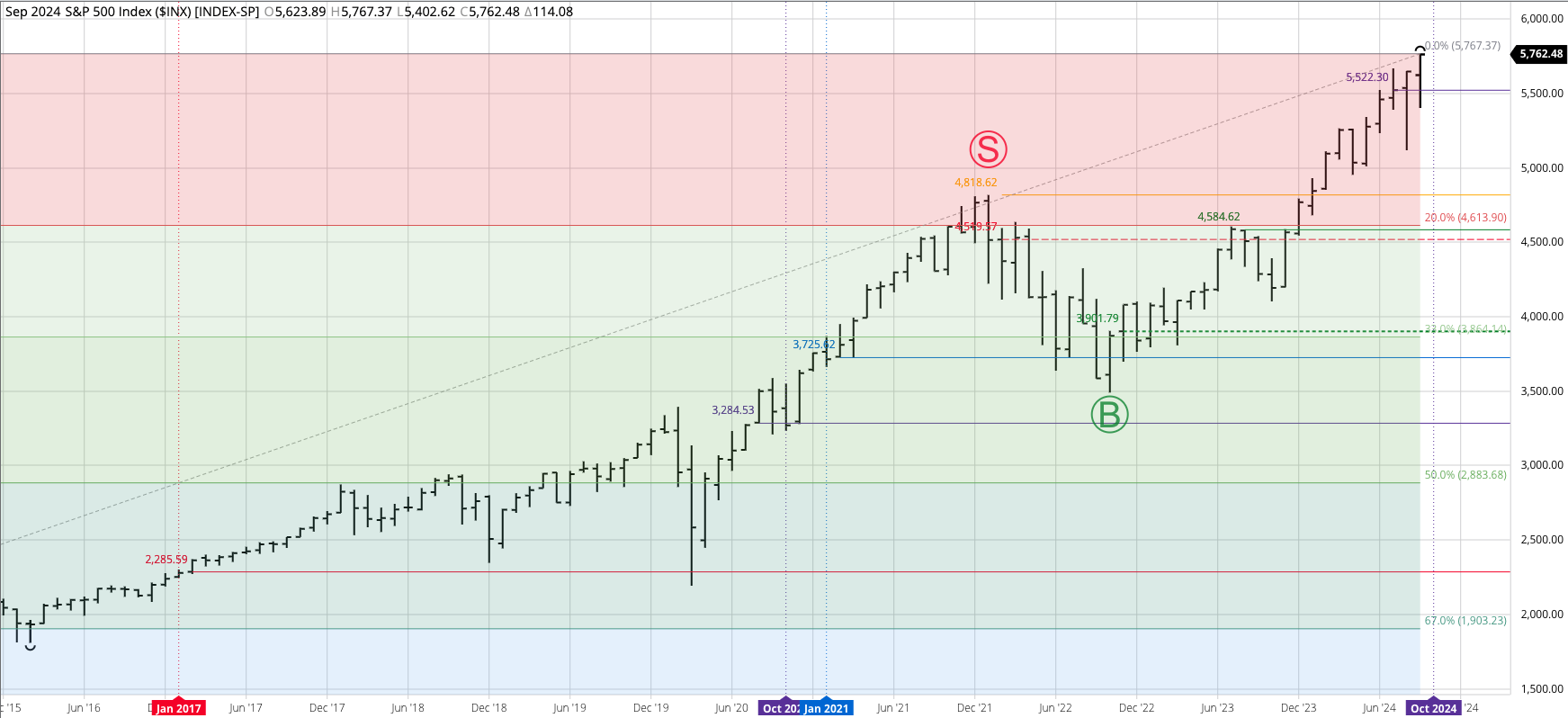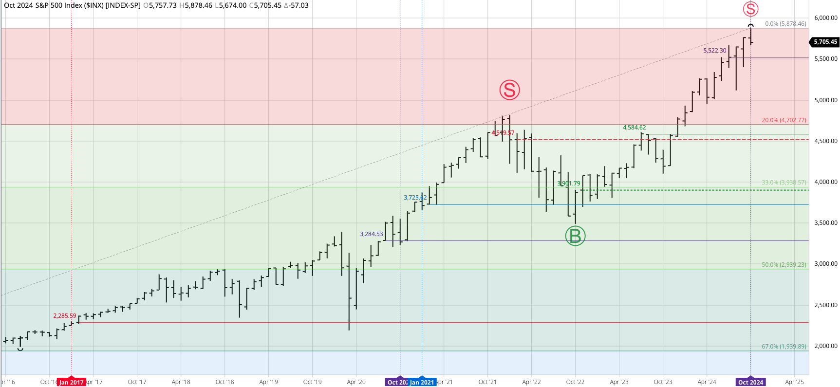 The S&P 500 ($INX) extended its a major (long-term) uptrend to a high of 5,878.46 before closing at 5,705.45, down 57.03 for the month. This completed a bearish spike reversal, [...]