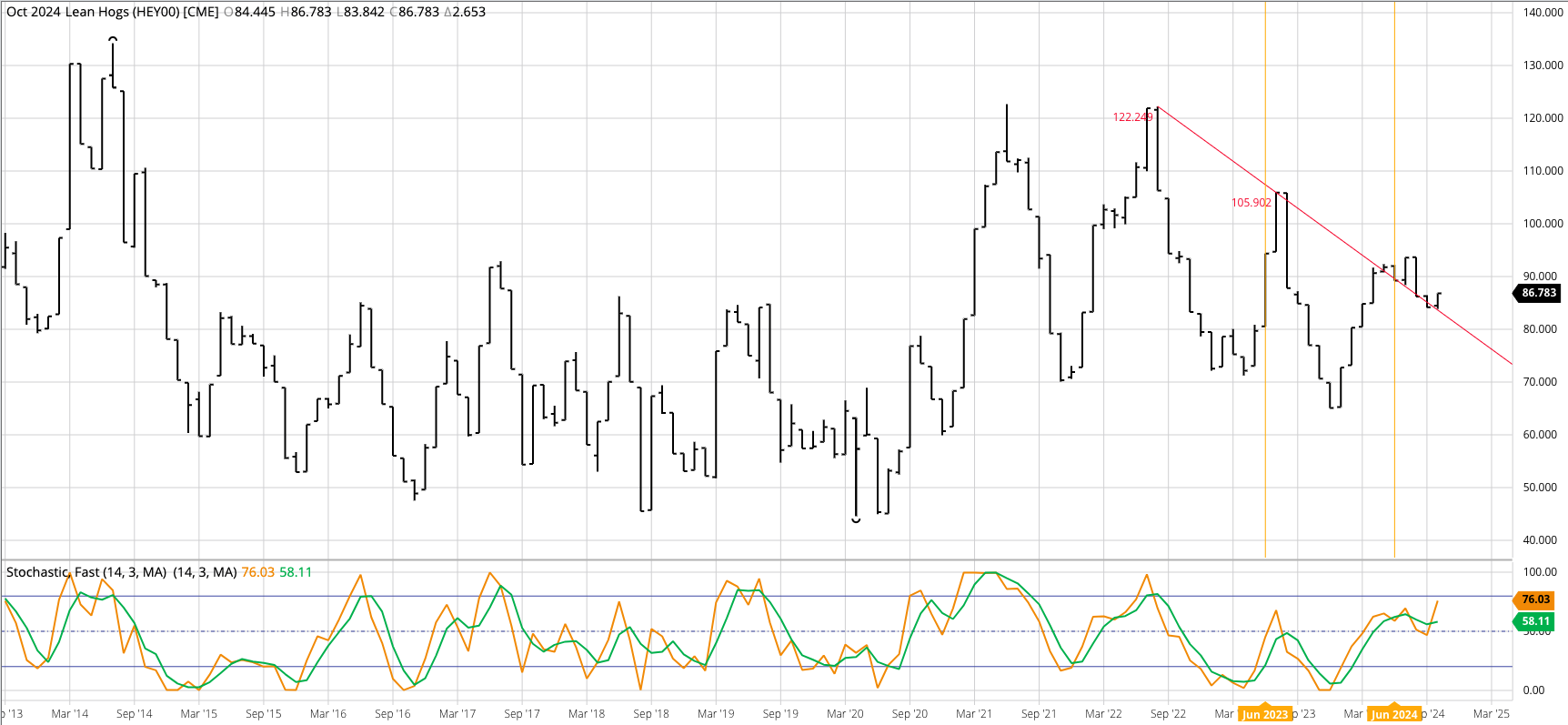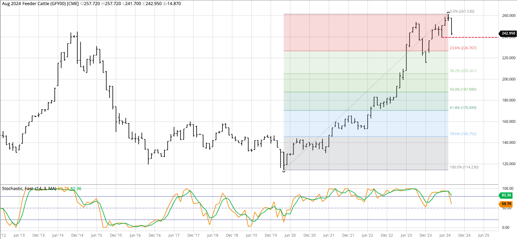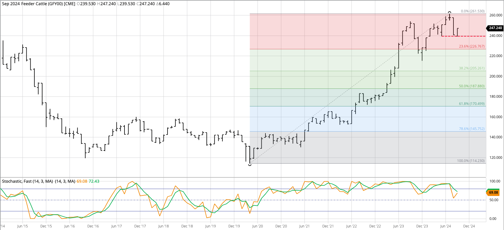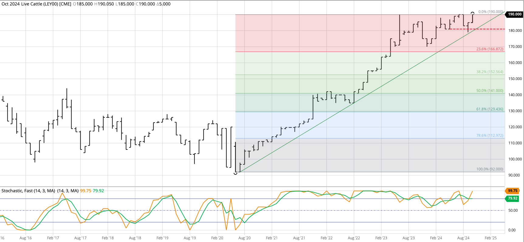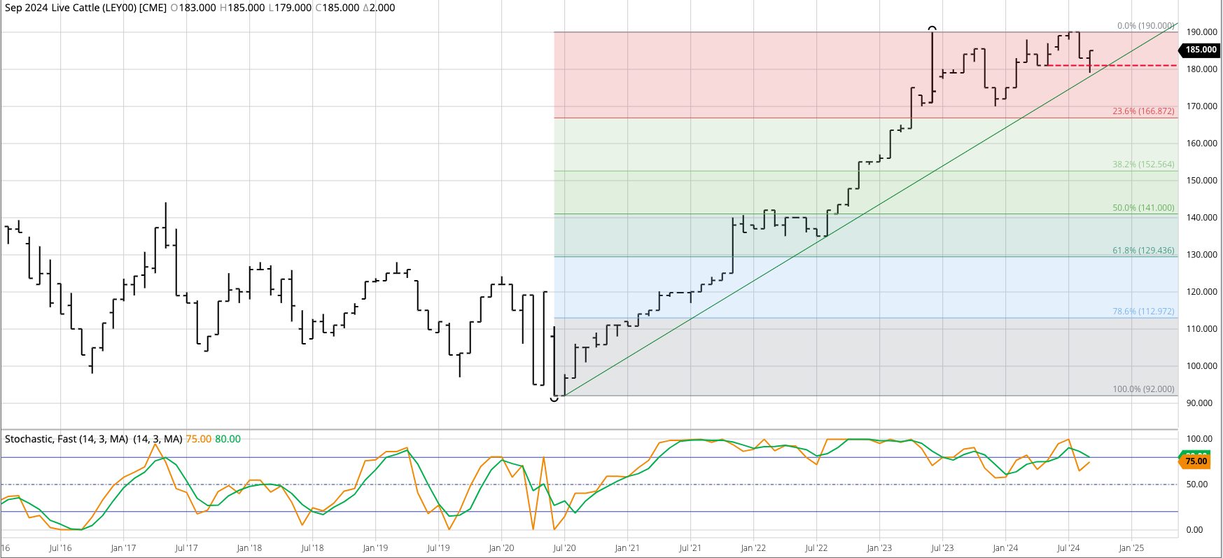 Live Cattle (Cash Index): The live cattle cash index sill looks to be moving toward a major (long-term) downtrend after posting what looks to be a double-top at $190 during [...]