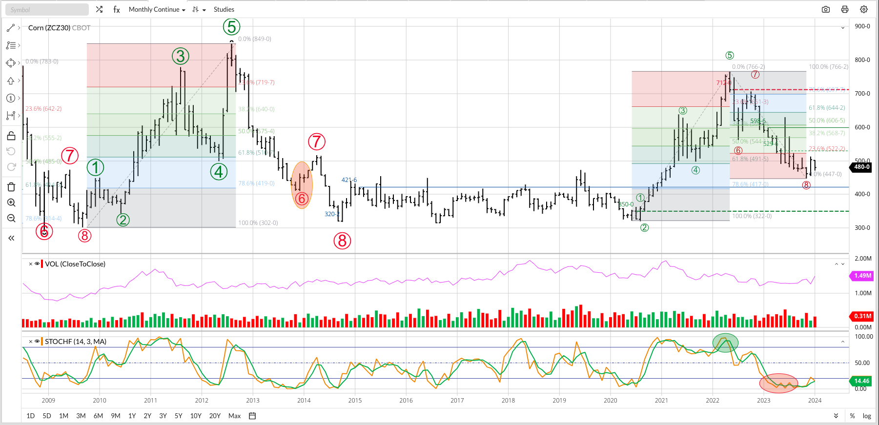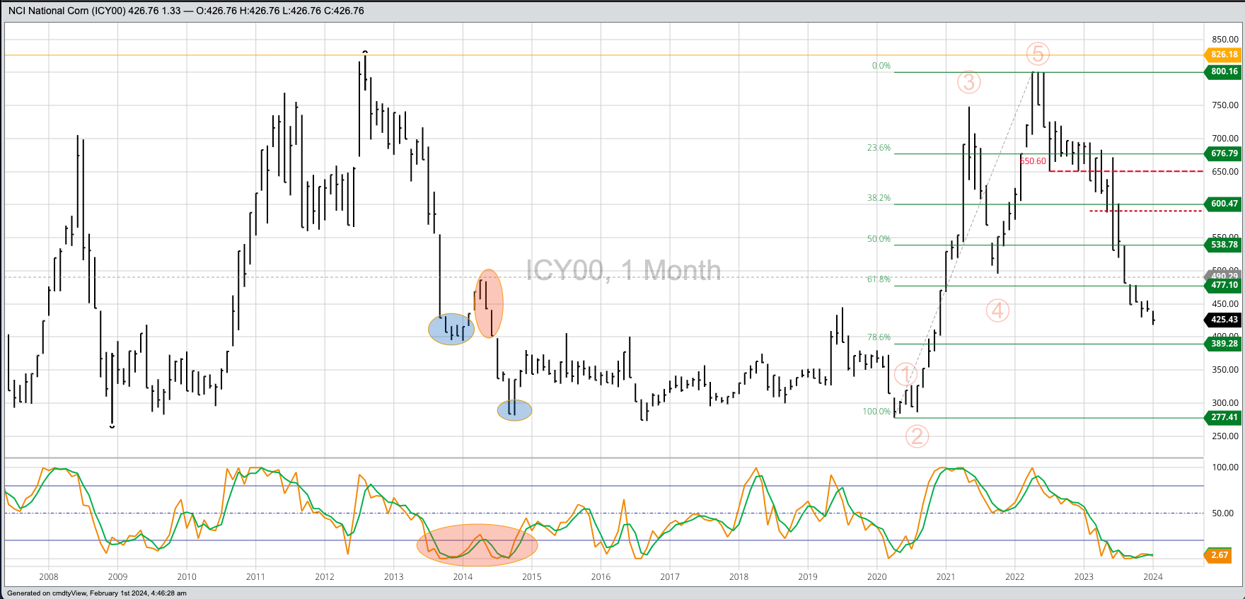 Corn Cash Index: The National Corn Price Index (NCI, national average cash price) extended its major (long-term) downtrend to a low of $4.1805 during January before closing at $4.2675, down [...]